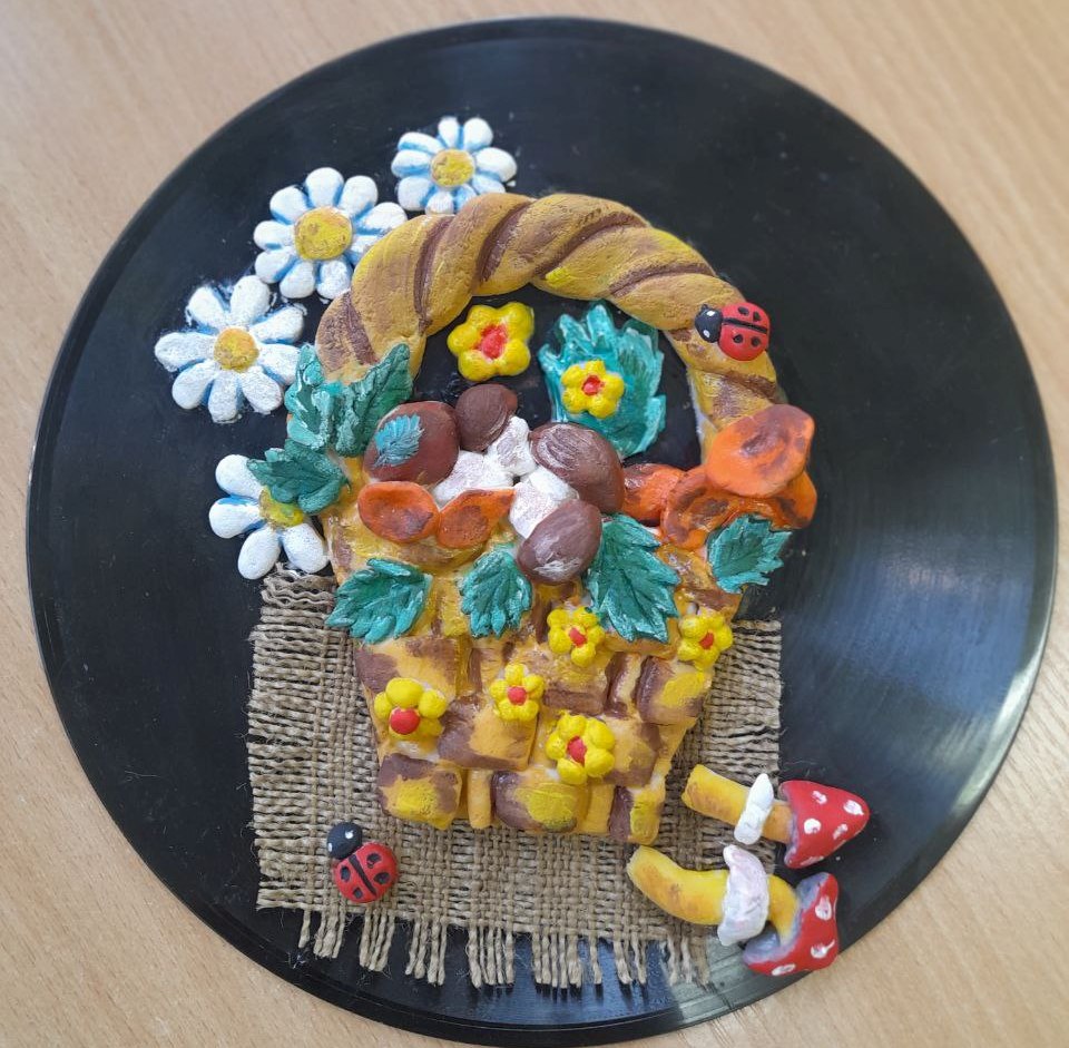 Панно выполнено на виниловой пластинке диаметром 24 см в технике тестопластики. Использованный материал - виниловая пластинка, мешковина, соленое тесто, гуашь.Данные участника