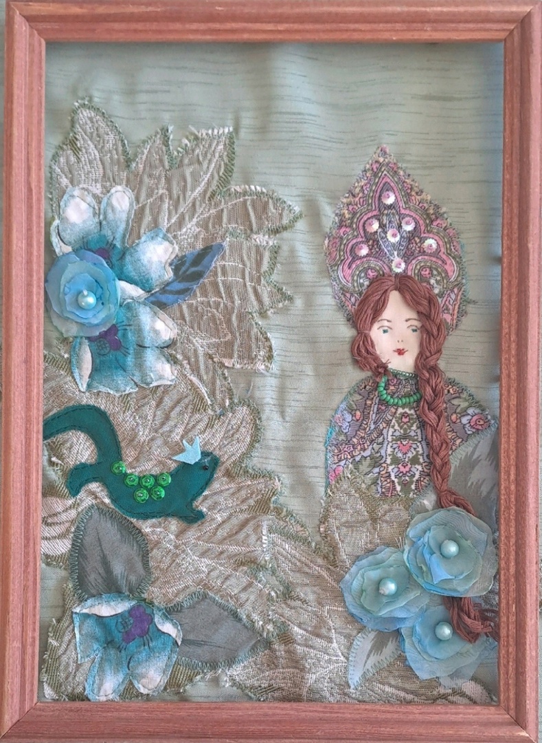 Текстильное панно выполнено по мотивам сказки П.П Бажова "Медной горы Хозяйка". При изготовлении панно использовались различные ткани зелено- изумрудных оттенков, бусы, пайетки, бисер.Данные участника
