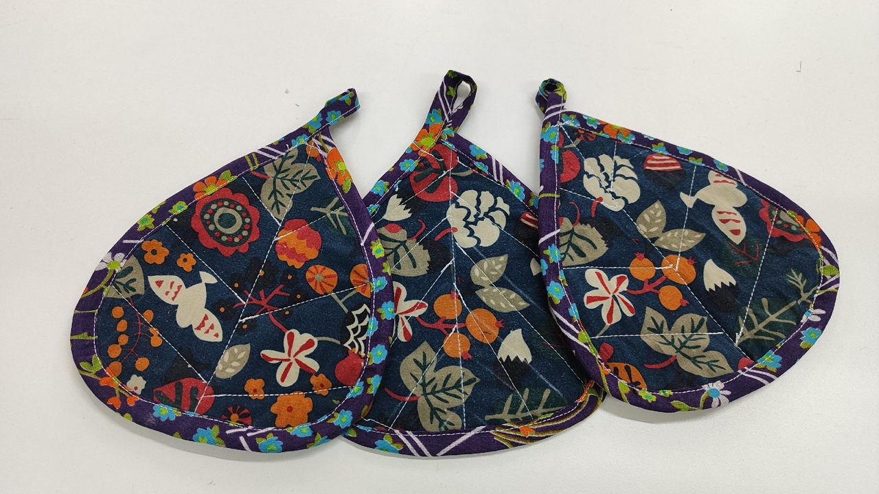 Прихватки сшиты из материала ситец . Обработаны обтачкой, сшиты из цветного материала. Во внутрь прихватки кладётся материал - ватин.Данные участника