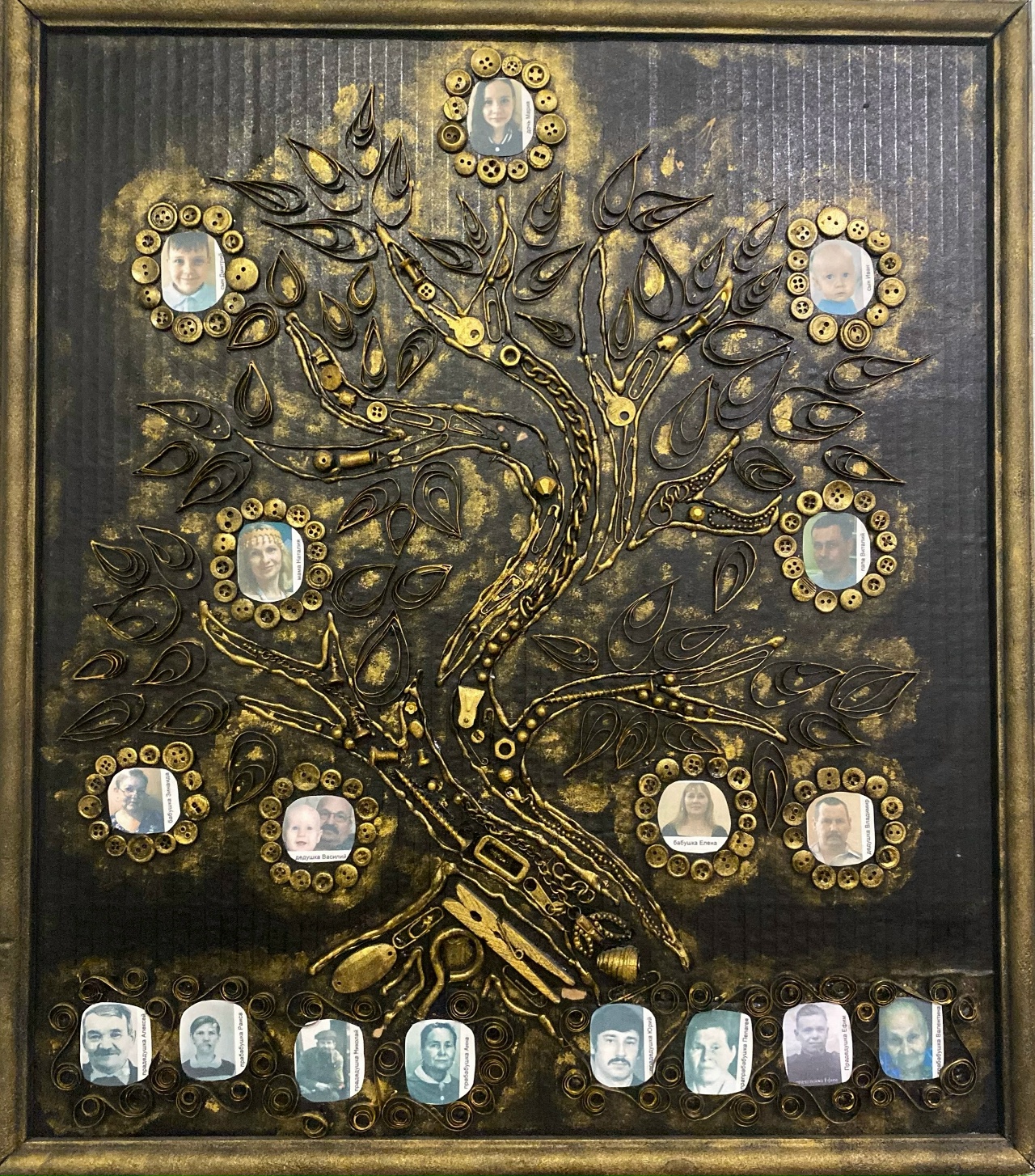 Разрешите представить Вам генеалогическое древо своей семьи. Данное панно выполнено в сочетании стиля стимпанк и техники квиллинг. Использованы в работе ненужные предметы, пуговицы, бумага, акриловые краски. Размер панно: высота-58 см, длина-51 см.Данные участника