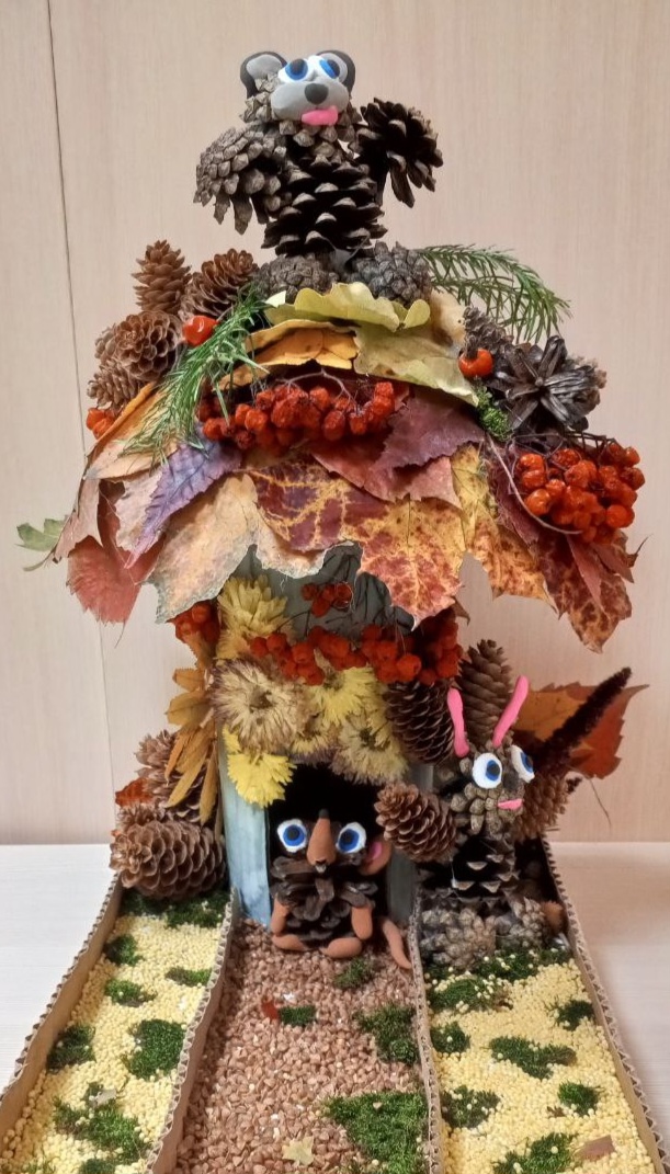 40х20х30, работа выполнена из природного и бросового материала (листья, шишки, крупы). Прогулки по осеннему лесу вдохновили на изготовление сказочного теремка из природного материала Пермского края.Данные участника