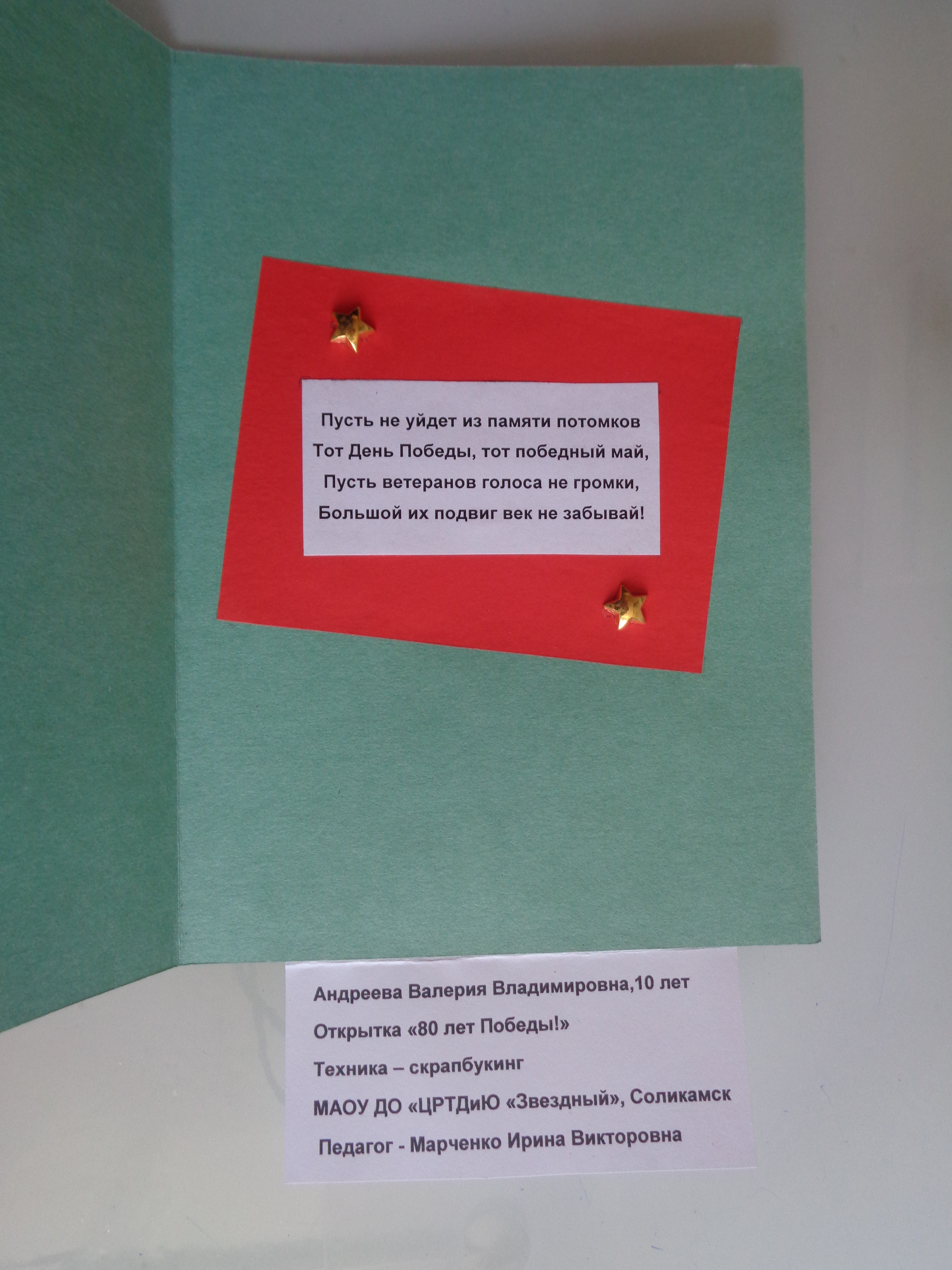 Размер 15 см на 20 см. Техника скрапбукинг. Открытка посвящена 80-летию Победы в Великой Отечественной Войне.Данные участника