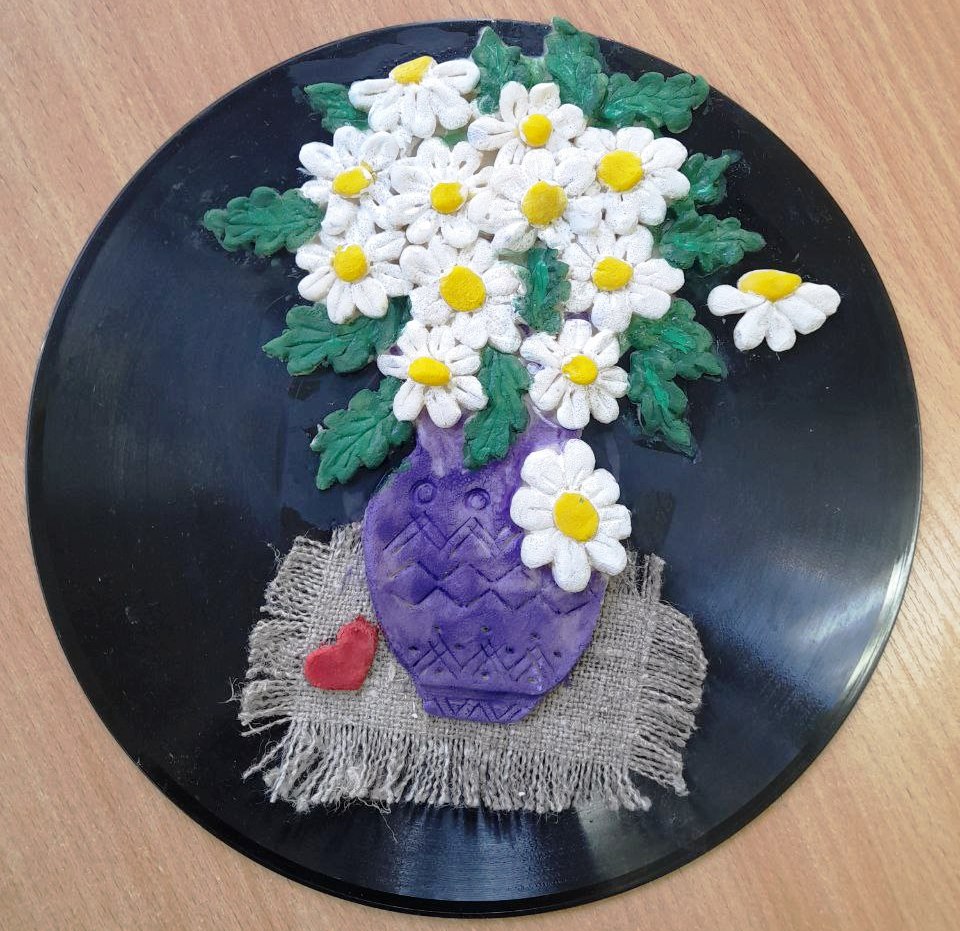 Панно выполнено на виниловой пластинке диаметром 24 см. в технике тестопластики. Виниловая пластинка, мешковина, соленое тесто, гуашь.Данные участника