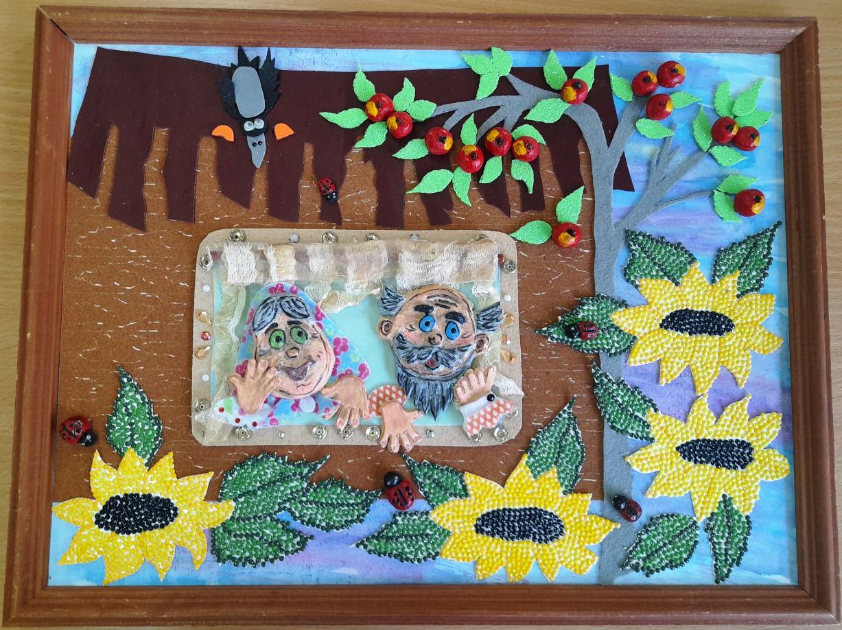 Панно 28*42 см в деревянной рамке выполнено в смешанной технике. Использованы мешковина, фетр, бархатная бумага, соленое тесто, бусины, гуашь.Данные участника