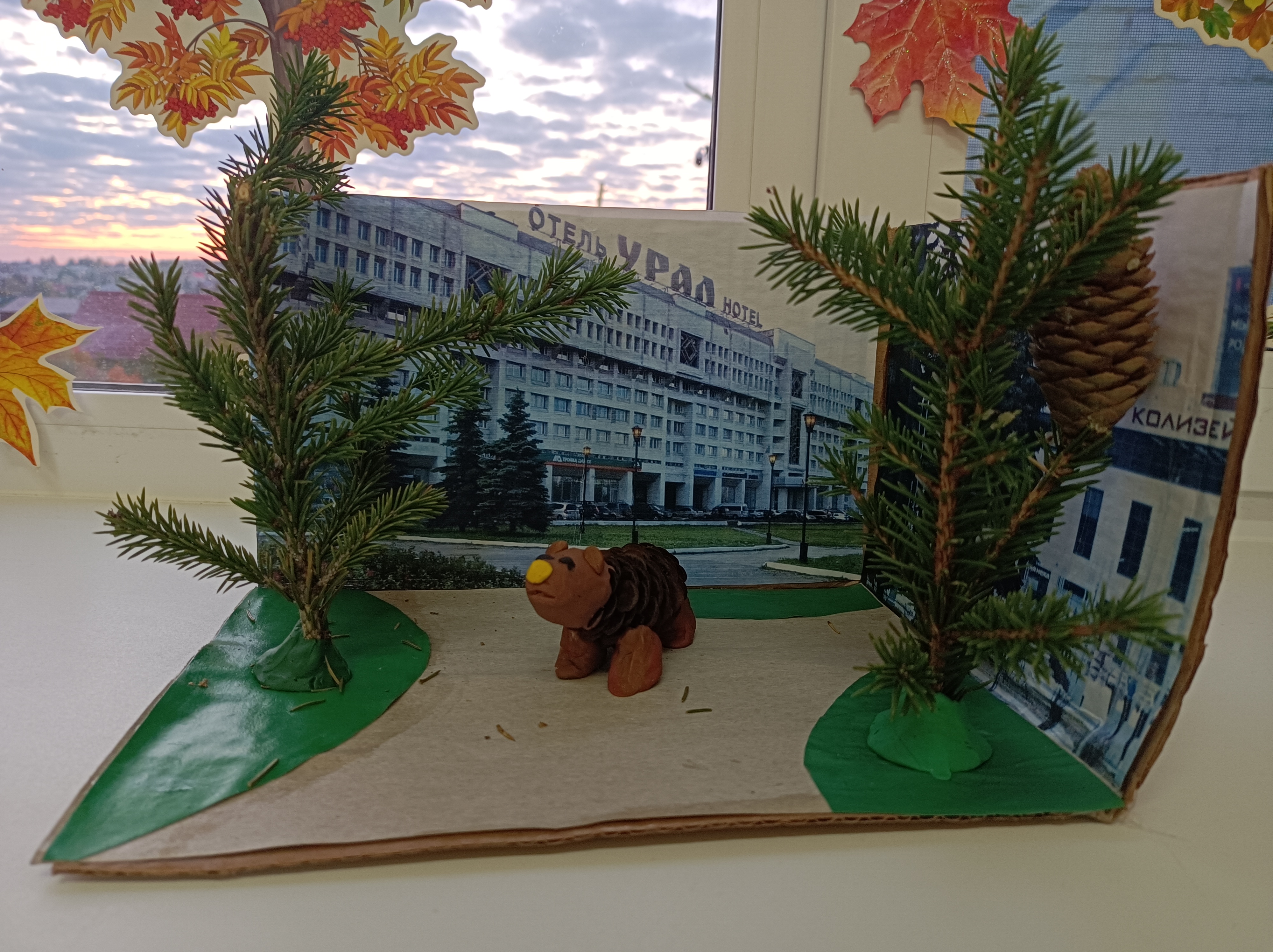 Медведь из еловой шишки и пластилина, еловые ветки, все детали установлены на коробку обклееная фотоизображениями достопримечательности города ПермиДанные участника