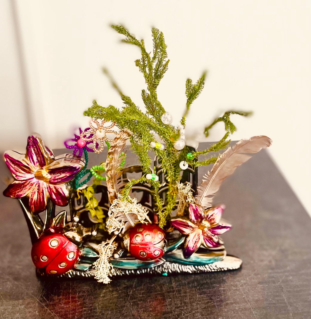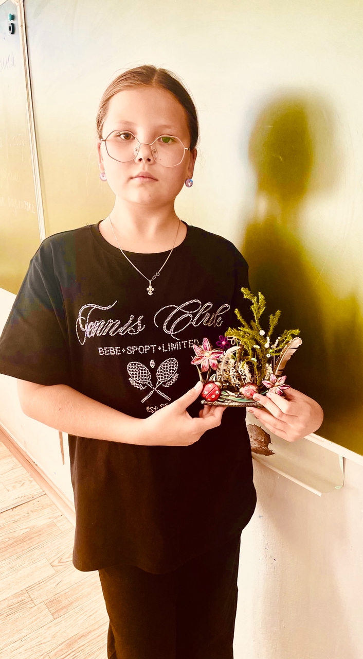 Размер работы 18 смХ 15 см, работа выполнена из глины, краски, лака, воздушного пластилина, бисера, проволоки, клея, разных видов мха.Данные участника