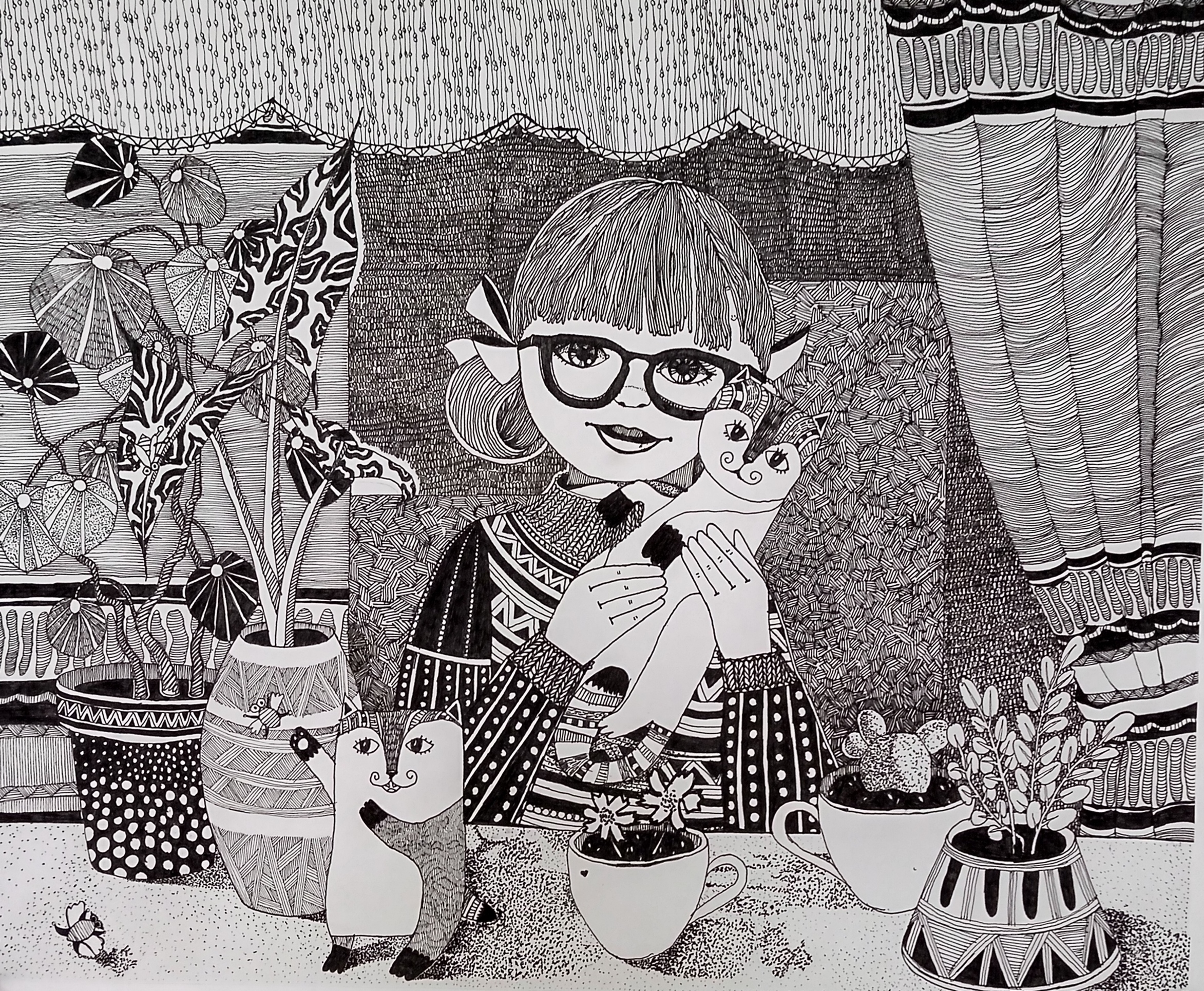 Размер работы 42*48 см, графика линерами. Портрет современника, который очень любит животных, которые хулиганят на подоконнике и любят поиграть с растениями. Забота, бережное отношение к братьям нашим меньшим, их воспитание, редко такие качество встретишь у подростка. Это её история.Данные участника