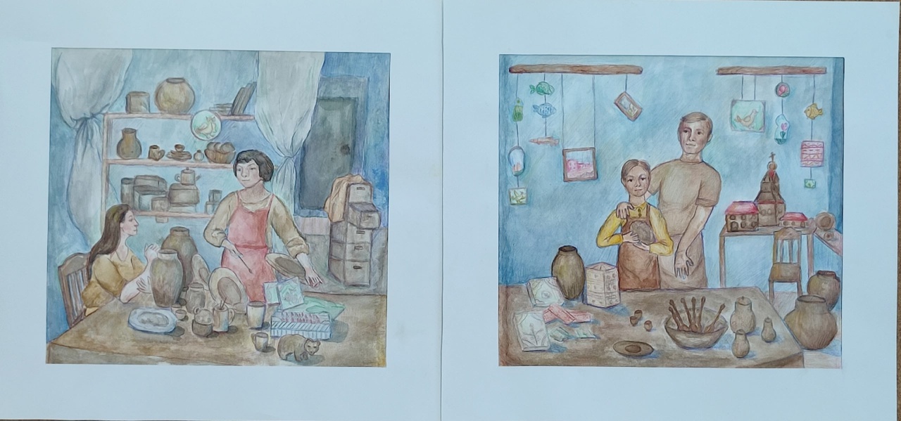Автор работы нарисовала диптих, в котором изобразила как мастера гончарного искусства обучают, передают знания своим ученикам. За основу взята мастерская, расположенная в музее "Палаты Строгановых". Материал: акварель, цветные карандаши.Данные участника