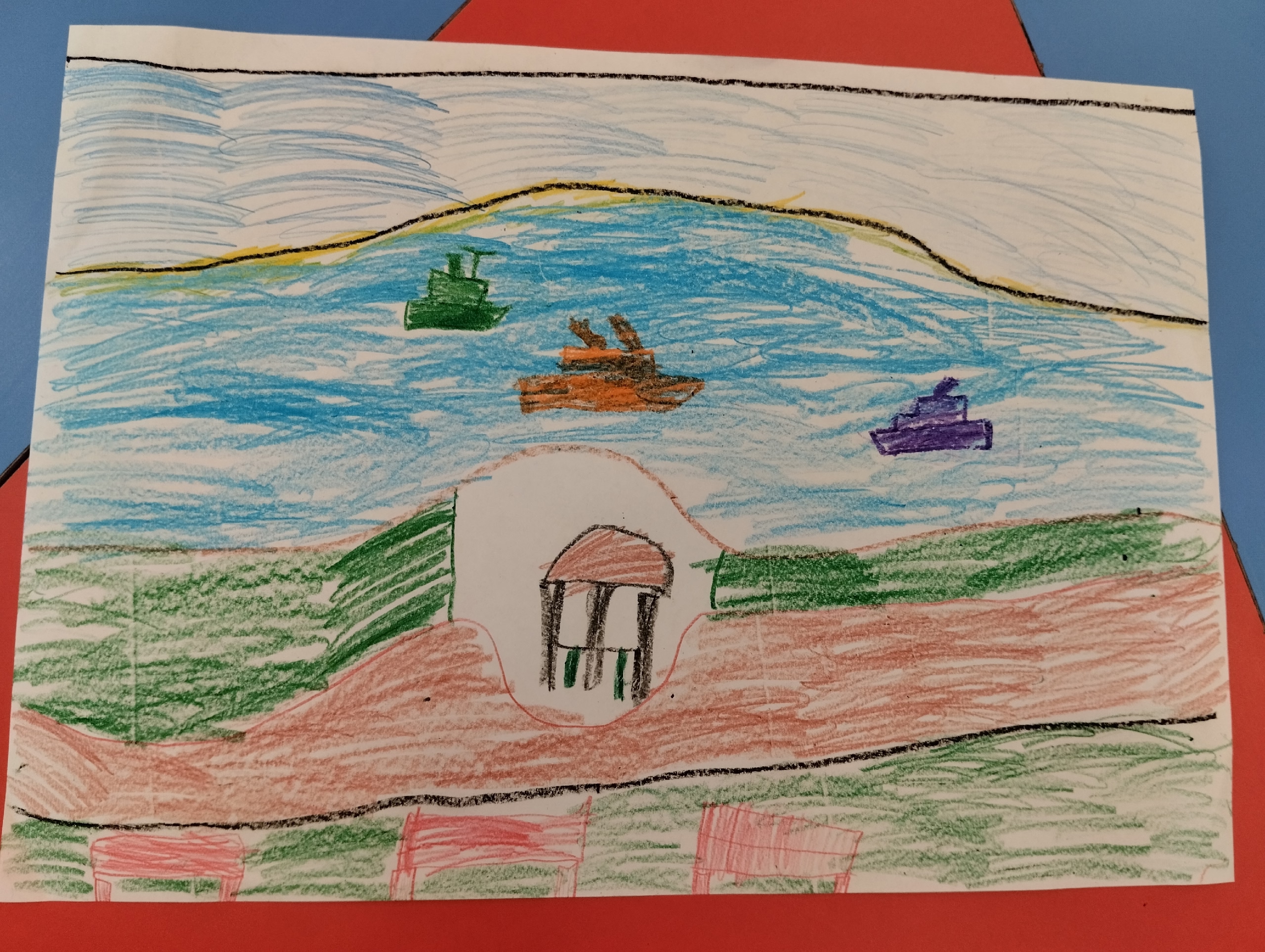 Работа выполнена на листе А3 карандашами и восковыми мелками. "Я Герман.Я родился в Пермском районе. Я очень люблю гулять по Перми.Несколько раз я с родителями и сестрой Ирмой был на набережной Камы и один раз даже катался на прогулочном теплоходе.Мне очень понравилось. Мечтаю еще прогуляться по нашей красивой и великой Каме!Данные участника