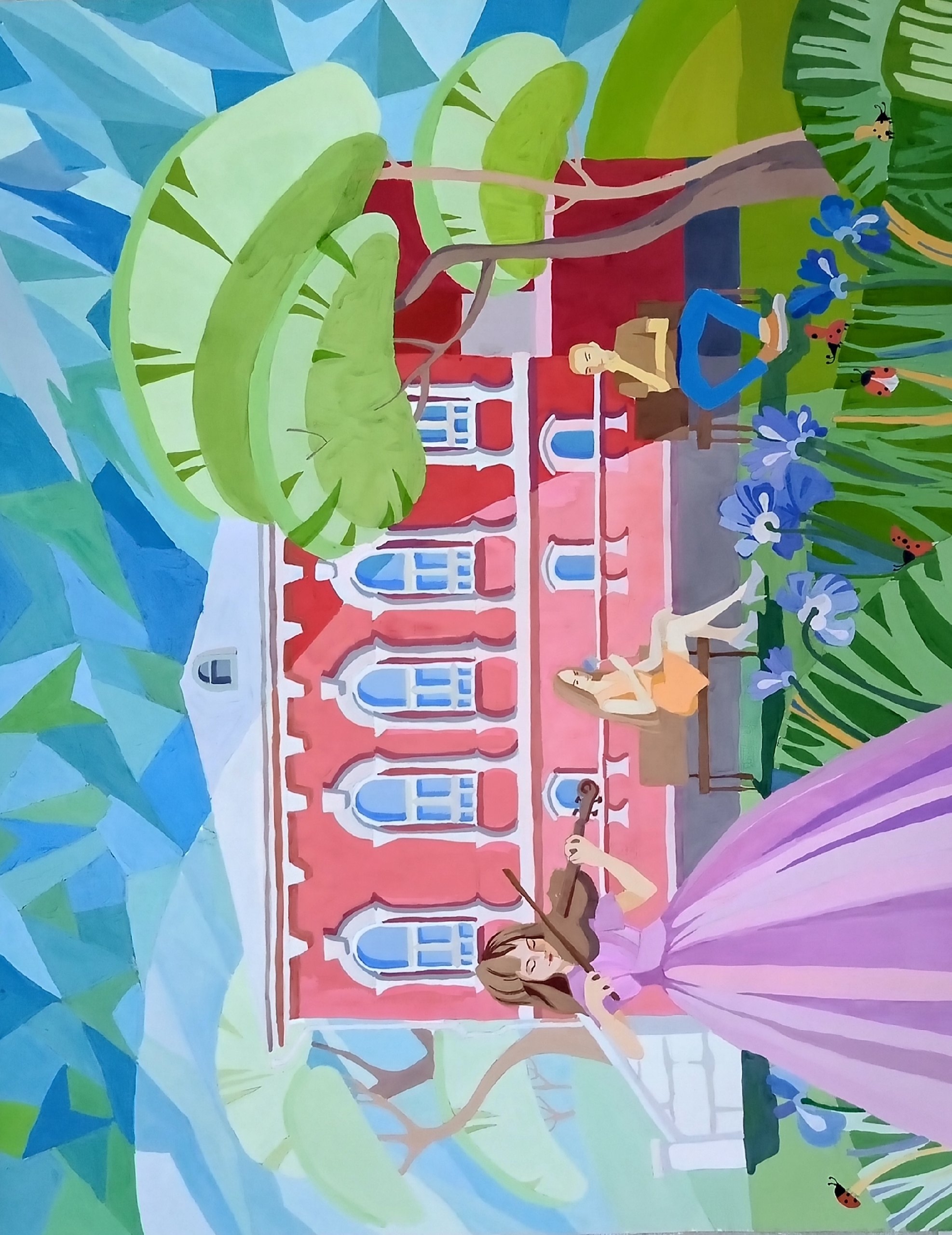 Размер работы 60*75 см, декоративная живопись гуашью. Весна. Пробуждение всего, начало чего-то нового. Девушка-весна (образ) играет музыку весеннего пробуждения, зарождаются новые чудесные отношения.Данные участника