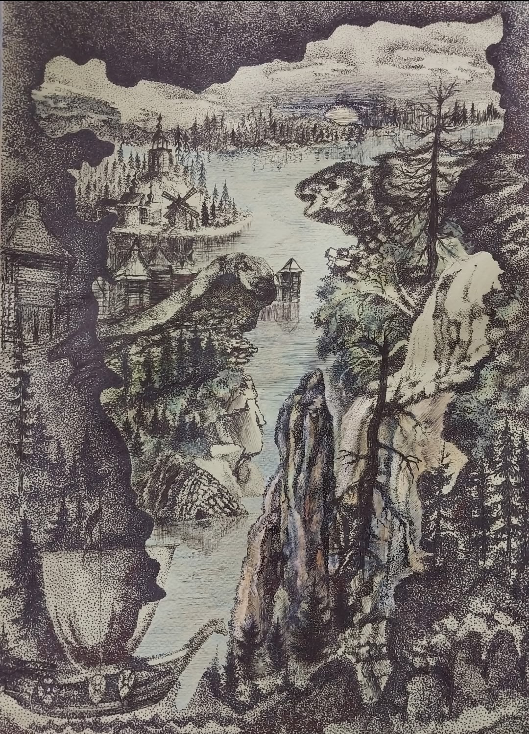 Формаз А3. Выполненотв графической технике гелиевыми ручками. Изображен образ рек: Чусовой, Усьвы, Койвы, Камы и камни-бойцы по берегам. А также природный парк Каменный город и Этнографический парк истории реки Чусовой в ЧусовомДанные участника