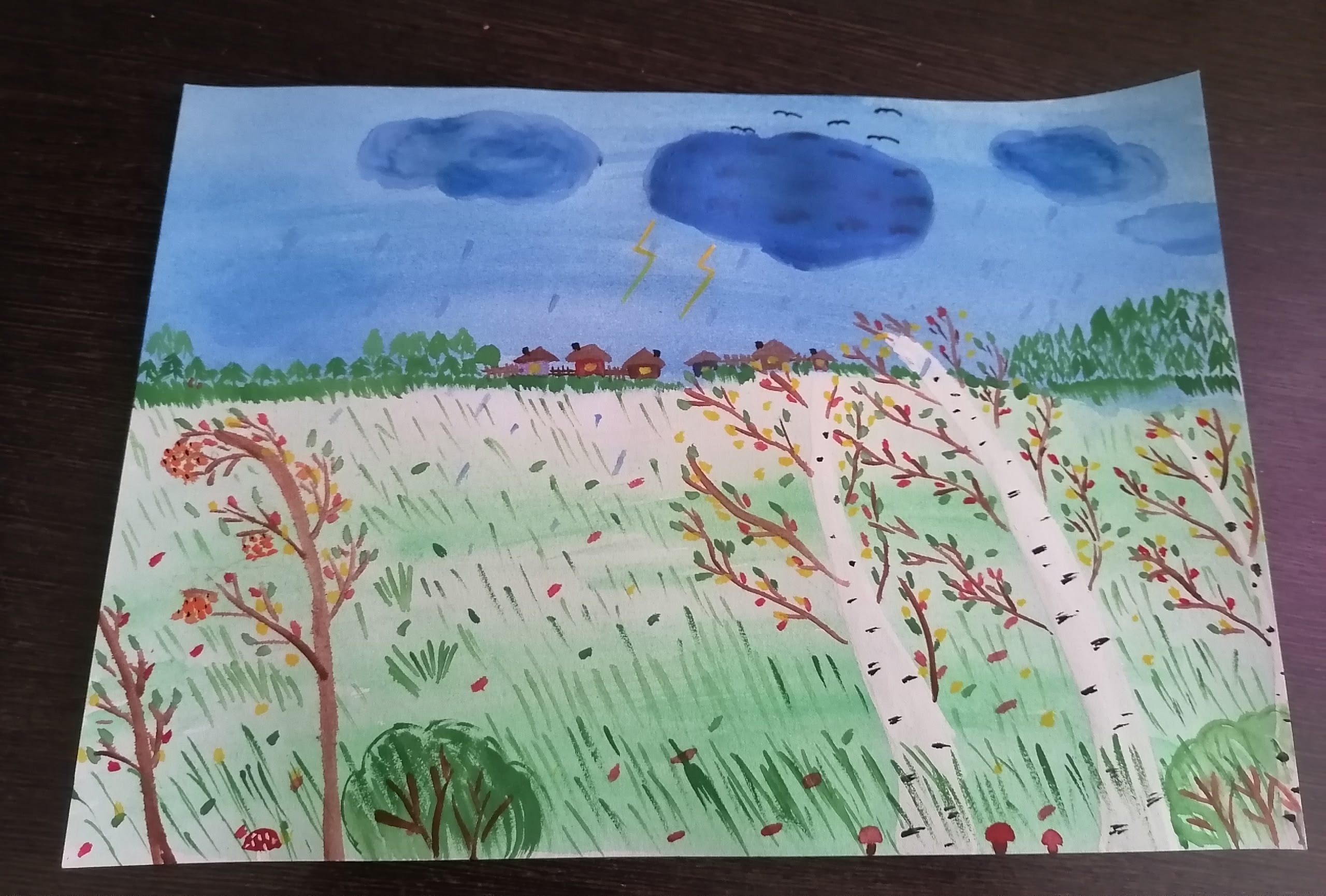 А4,гуашь.На рисунке показана осень.День ветреный,дождливый с грозой.Листья падают яркими красками.Данные участника