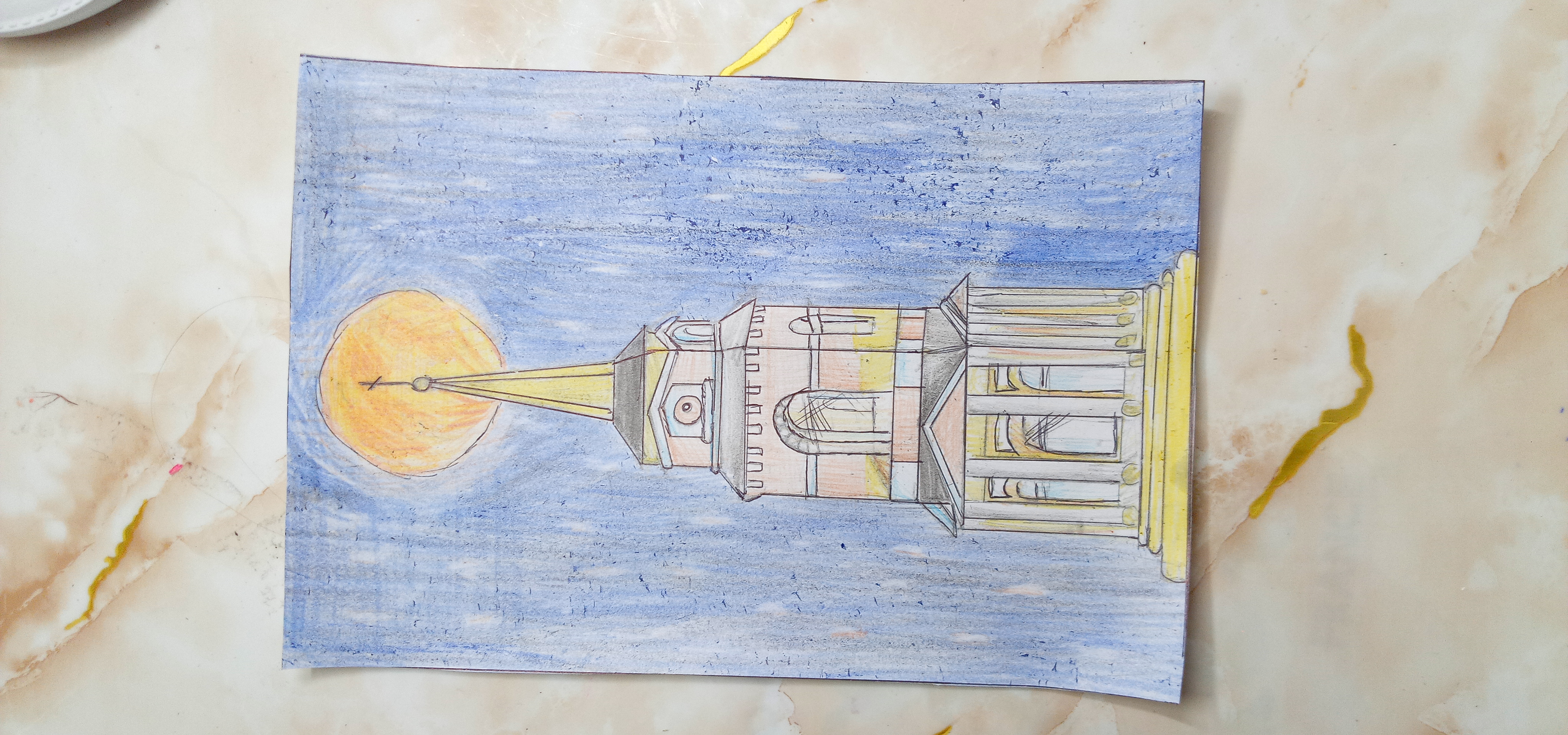 Размер работы 21,5*14,5 см, рисунок нарисован цветными карандаши и всё, Пермская художественная галерия под восходом луныДанные участника