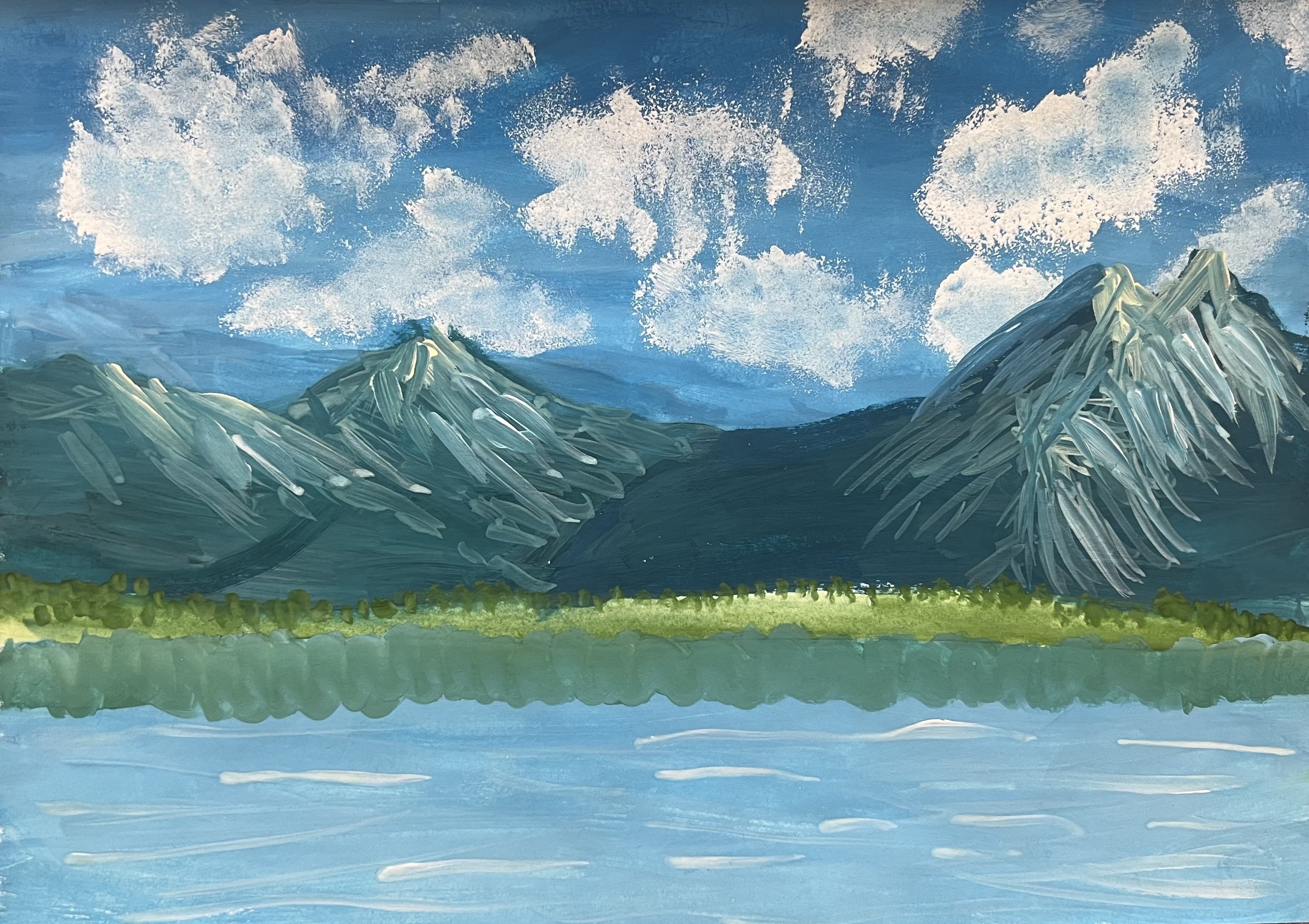 А4, гуашь. Вид на Тулымский Камень с реки Вишера. Тулымский Камень — горный хребет на Северном Урале, Пермского края. Длина хребта составляет 35 километров. Самая высокая точка хребта 1469 м (гора Острая). Является высшей точкой Пермского края.Данные участника