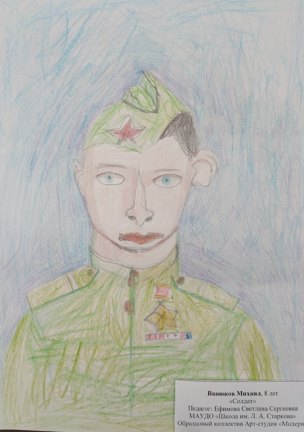 Автор работы изобразил портрет героя, участника военных действий. Материал: цветные карандаши.Данные участника
