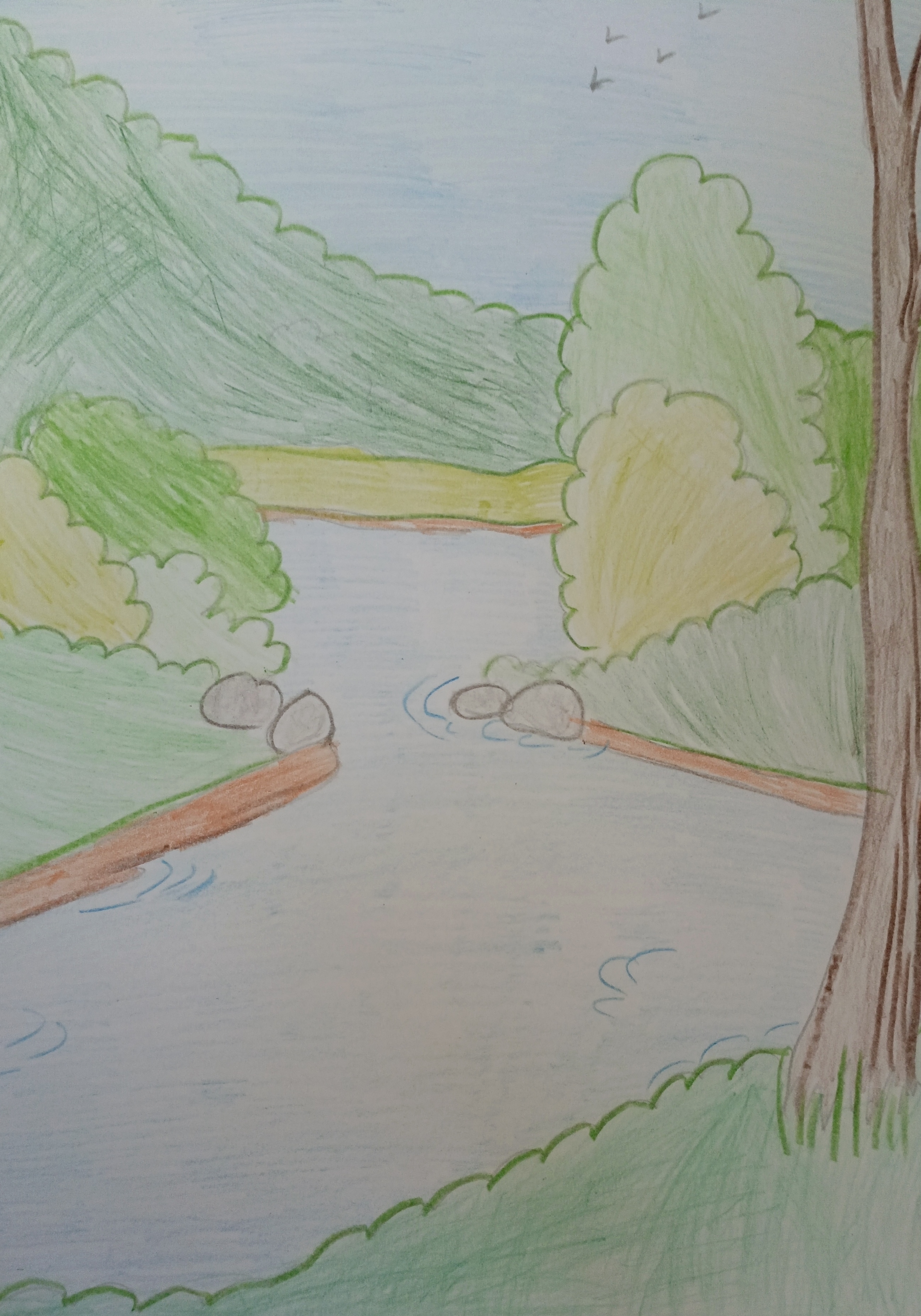 Рисунок нарисован цветными карандашами. На рисунке изображена река Сылва.Данные участника