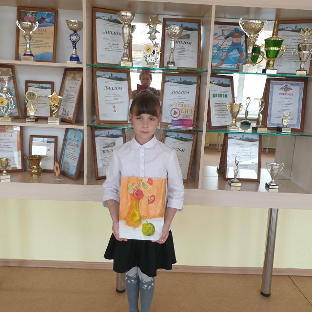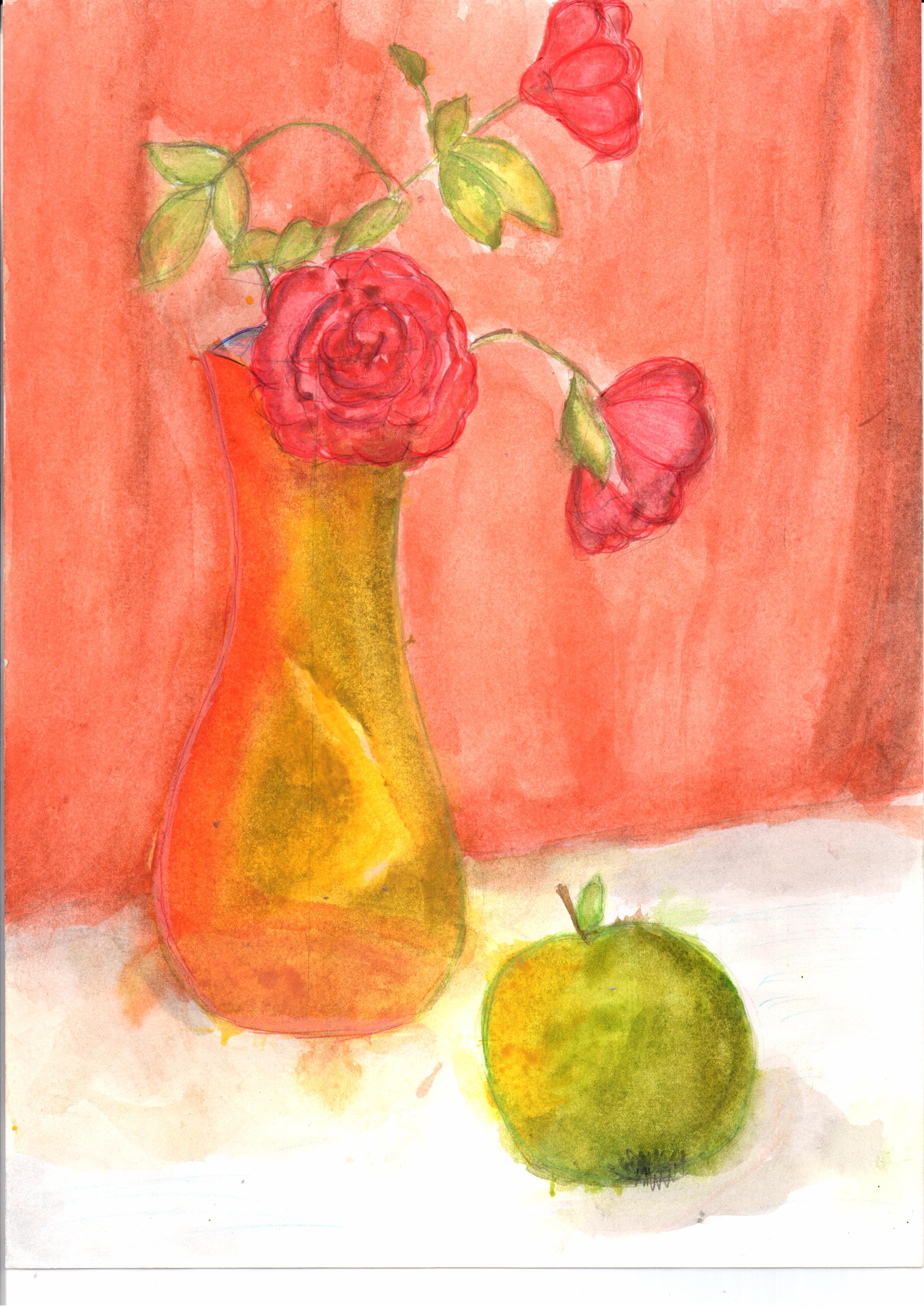 Натюрморт на листе А-4. Смешанная техника. Материалы: акварельные краски, карандаши. Семейная работа.Данные участника