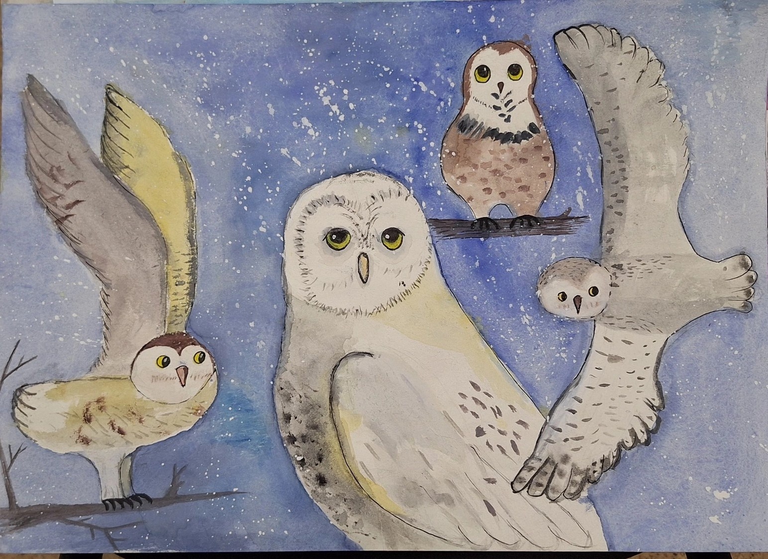 Живопись, бумага, акварель, гуашь, 29х42. Изображены совы Пермского края.Данные участника