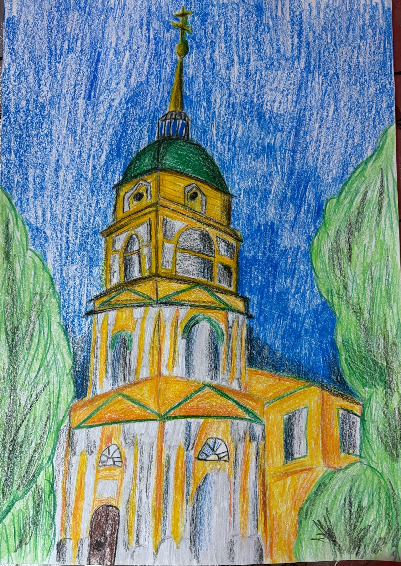 Размер работы - 29,7 × 42 см (лист А3). Техника выполнения - графика, цветные карандаши. На рисунке изображена церковь Рождества Иоанна Предтечи, которая находится в селе Ленск, Кунгурского района, Пермского края. (прошу прощения если пришло несколько раз, были проблемы с компьютером).Данные участника