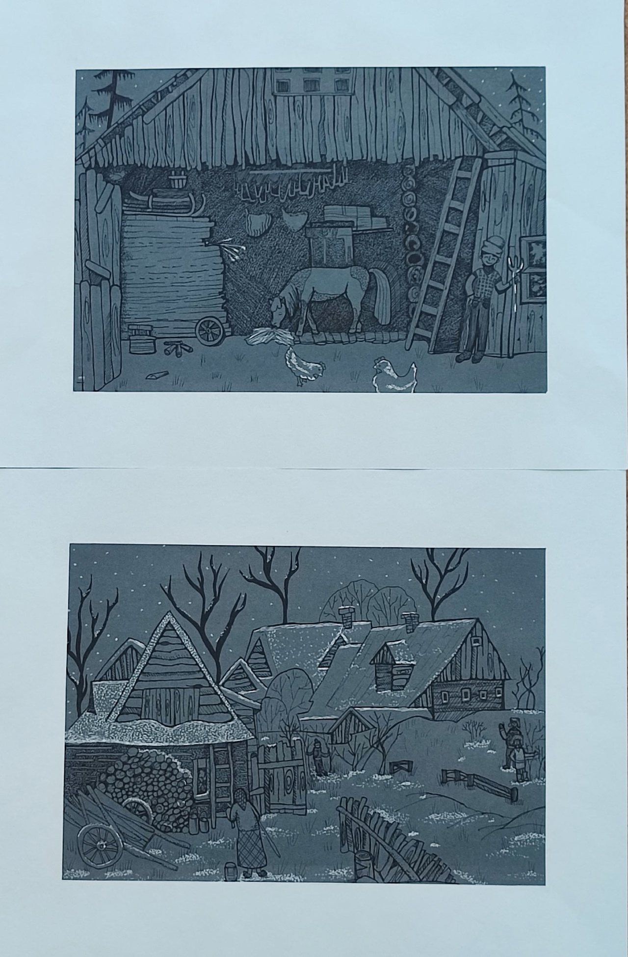 диптих.графика. Оба рисунка наисованы гелевыми и перманентмыми ручками черного, белого цвета на пастельном листе бумаги. Автор в своих работах размышляет о жизни в деревне, чем занимаются люди, как они готовятся к зиме.Данные участника