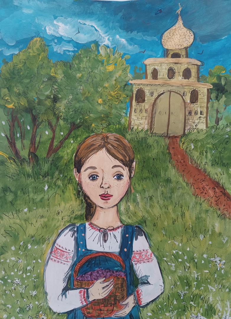 Формат А4, живопись. Девочка в национальном костюме коми-пермячки, в праздничный день идёт в хрм. В корзине несёт собранные дары от природыДанные участника