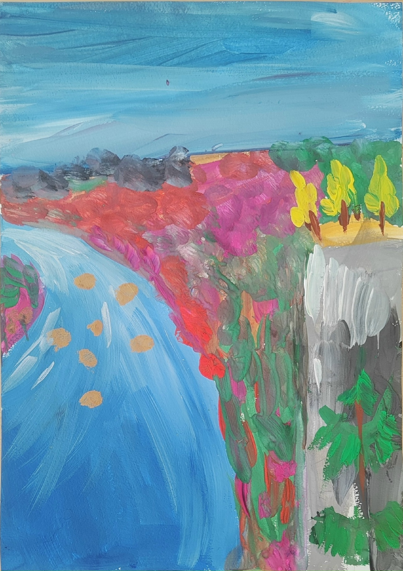 Рисунок выполнен гуашью, формат рисунка А3. На рисунке изображена природа севера Урала. Союз двух стихий тесно переплетаются на этом рисунке. Прекрасная река Вишера и камень Ветлан прекрасны в любое время года.Данные участника