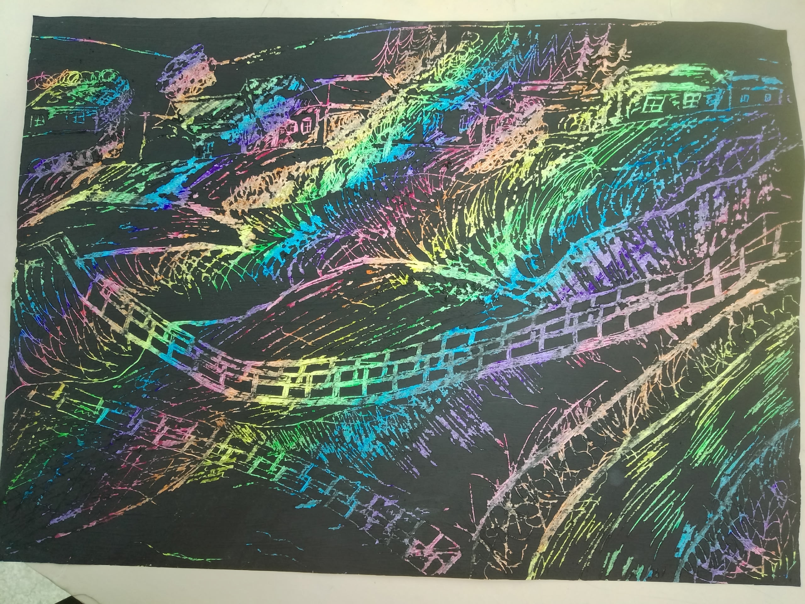 А-3, граттаж. Изображен мост через реку Койва в посёлке Кусье- Александровский.Данные участника