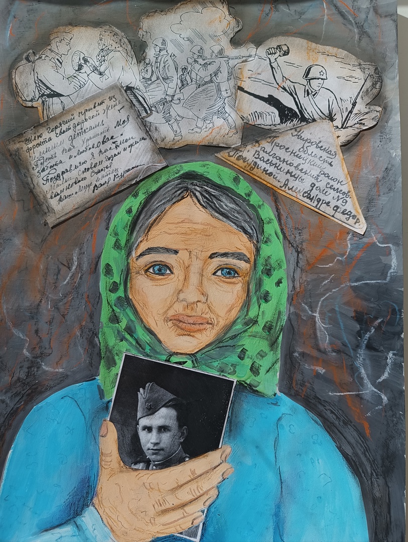 Формат А3, Совмещена живопись с аппликацией. Спустя много лет после ВОВ, старенькая мать читает письма и крепко прижимает к груди фотографию своего сына. Вспоминает, как провожала его на войну. О том, как он совершал подвиги отдав свою жизнь, защищая свою Родину .Данные участника