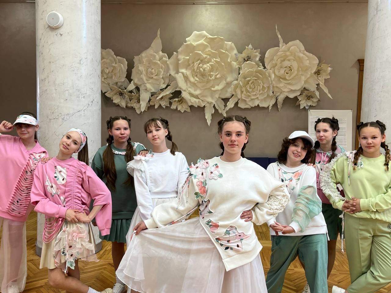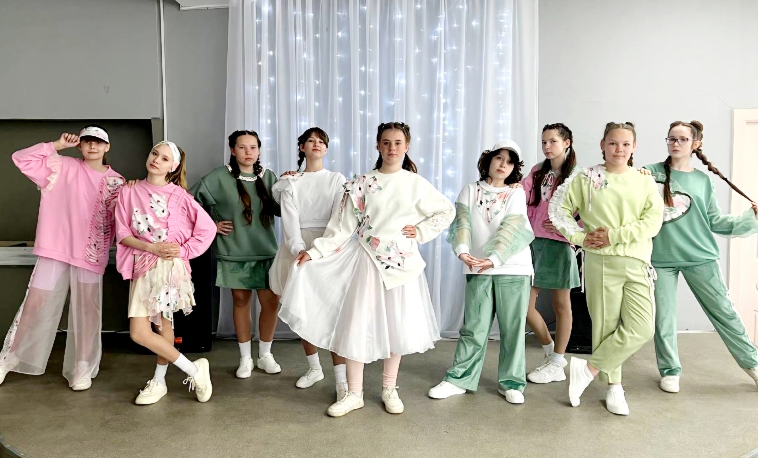 Как капля акварели цветочный принт расплывается по нежным тонам моделей в спортивном стиле, делая их более изящными. Легкая драпировка из воздушной органзы поддерживает тему акварельной живописи. Смелым , современным решением стало внесение в спортивный стиль романтических элементов одежды.Данные участника