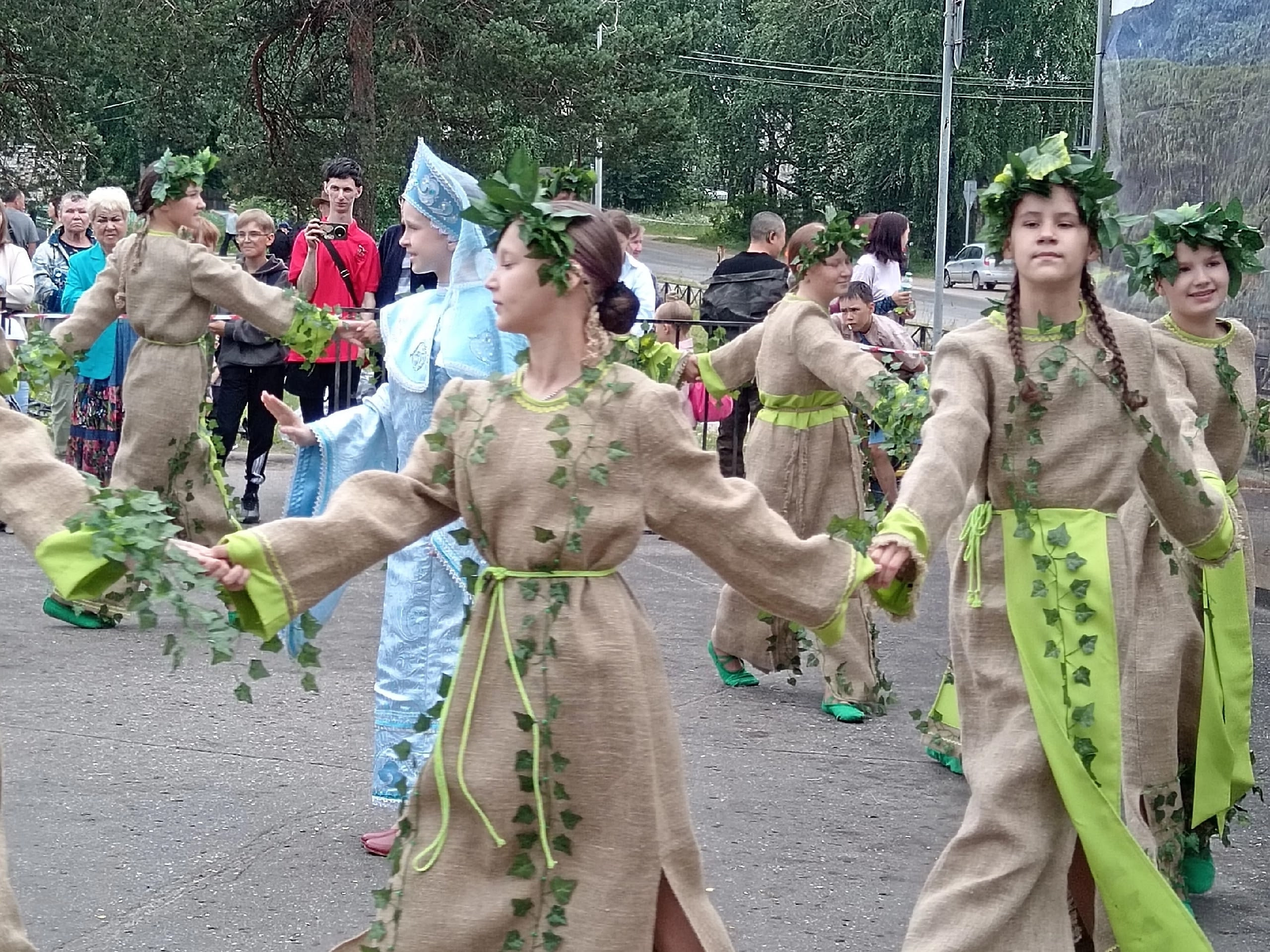 Коллекция выполнена из мешковины, дополнительная ткань габардин зеленого цвета, головные уборы венки из листьев.Данные участника