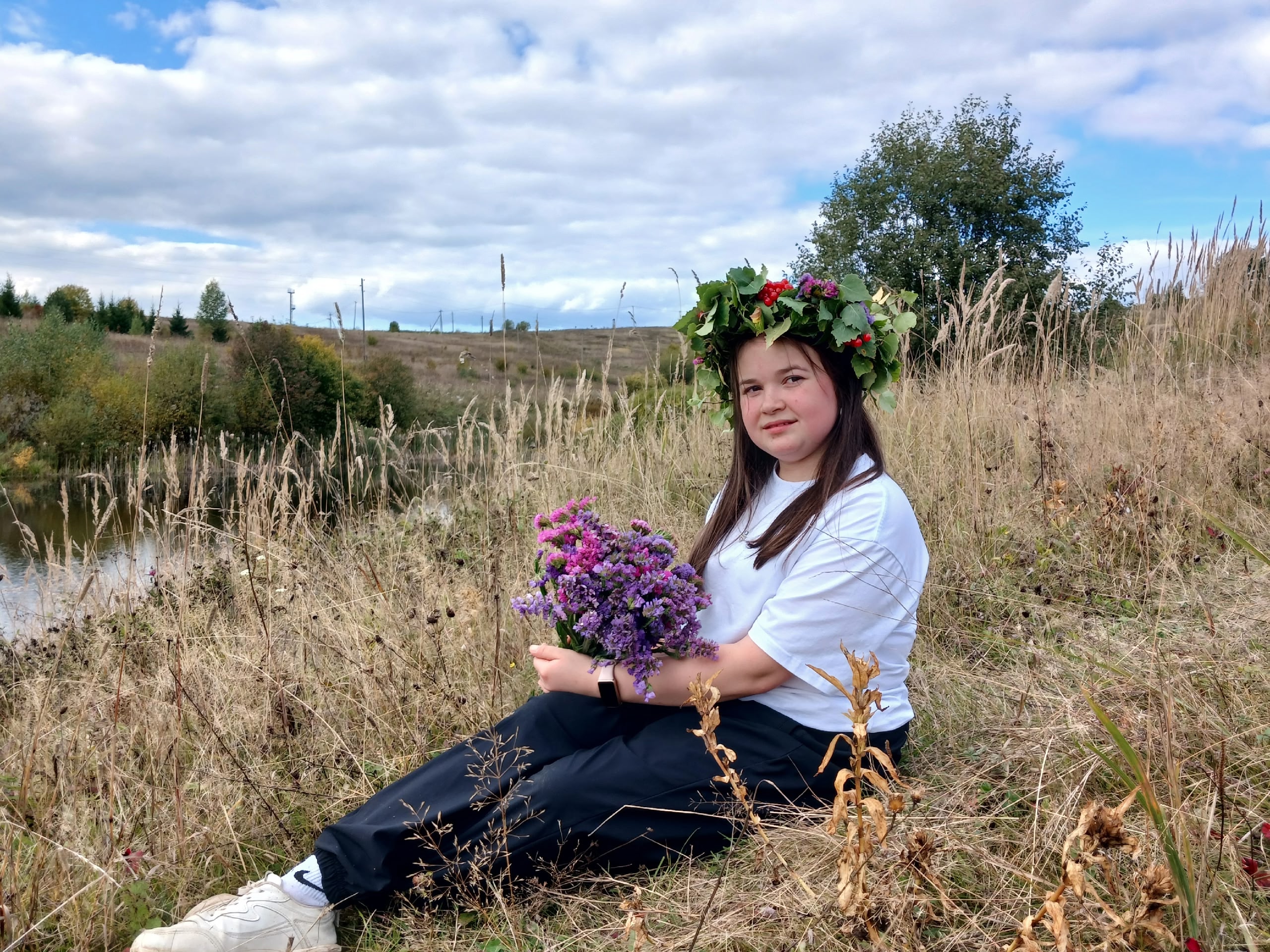 (Идея: привлечение в образ народного костюма природных материалов, бисера, фоамирана)Пермский край — многонациональный край, где проживают представители более 120 народов, что способствует созданию особого колорита.Пермский край – это уникальные и неповторимые места, где сочетаются горы и реки, озёра и пруды, где природные просторы и красота зовут к творчеству. Вот и мы сегодня представляем народные мотивы. Перед вами две девочки в русских народных платьях.Их наряды переливаются оттенками нежной сирени и яркой калины, создавая праздничную атмосферу родного края. Пермячки облачены в одежду, выполненную с любовью и уважением к культуре Урала и народным традициям. Фиолетовые и красные оттенки подчеркивают глубину местных мотивов весны и осени.На девочках надеты украшения ручной работы с настоящими цветами, которые были собраны с полей Пермского края.Ярко-жёлтая ромашка символизирует радость, солнечный свет, а также связь с природой и её красотой. В Пермском крае довольно часто встречается как данный цветок, так и другие. В дальних поездках эти скромные цветы будут напоминать о родине.В народной культуре и фольклоре ярко-красные ягоды калины показывают женскую красоту и молодость, именно поэтому на одной из моделей браслет, напоминающий данную ягоду.Из украшений присутствует и слегка заметная верёвочка из бисера, дополняющая подвеску со статицей, тоже с полей Пермского края.Серьги из бисера в осенних цветах отлично дополняют образ и делают его ещё ярче.Повязки на голове в традиционном стиле завершают наряды, подчеркивая важность головного убора в народном костюме.Вот так мы видим, как эти наряды воплощают дух Пермского края, отражая гармонию красоты и простоты. Изображение пропитано радостью и искренностью, оно напоминает о важности сохранения культурных корней, ведь именно через традиционную одежду мы передаём будущим поколениям уважение к своей истории и любовь к родному краю.Данные участника