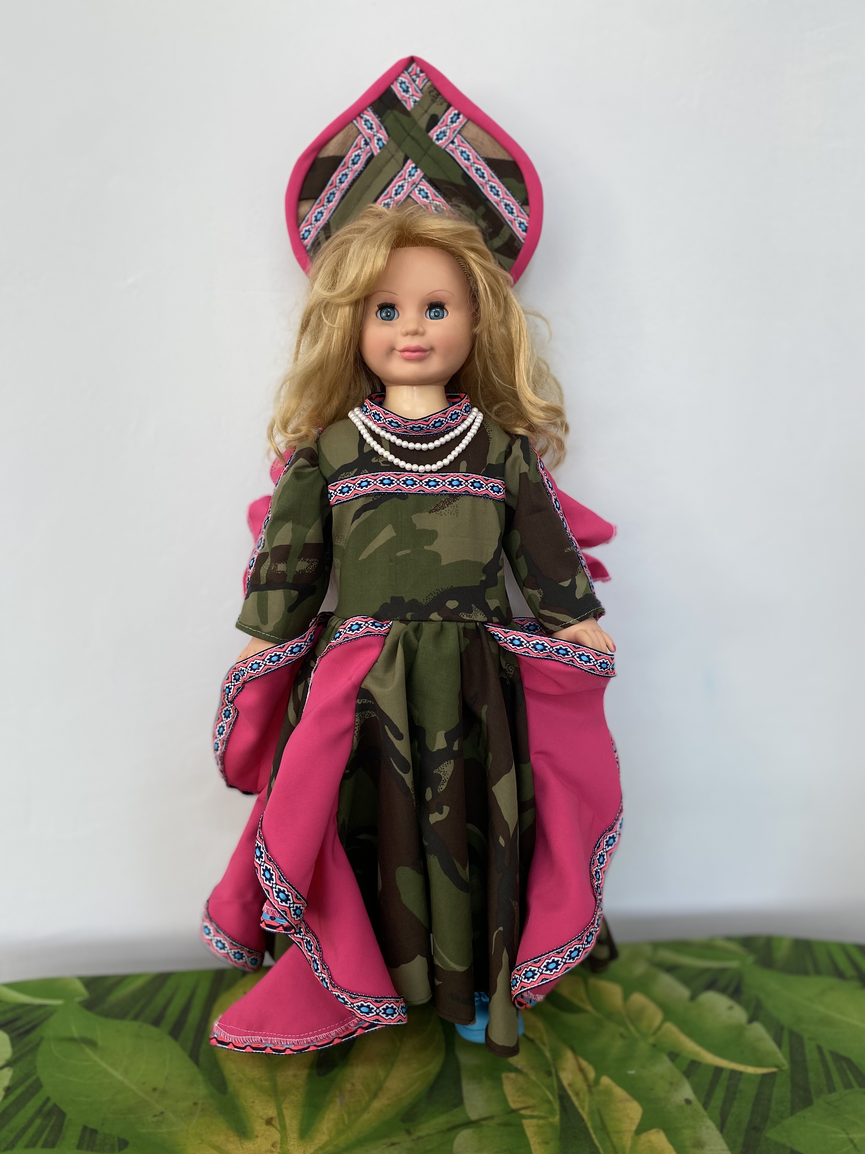 Костюм для куклы, выполненный из ткани с военным принтом, с добавлением элементов из тесьмы и габардина (розового цвета). Работа выполнена на швейном оборудовании, а также сшита вручную.Данные участника