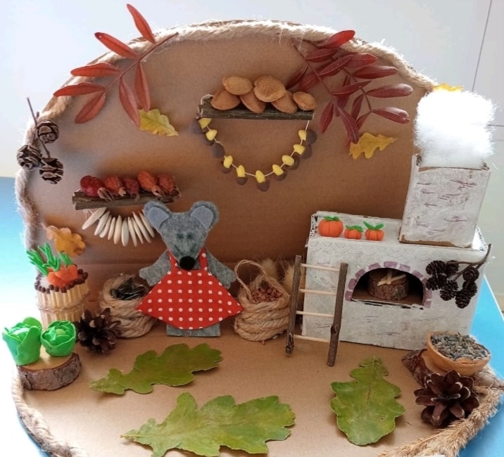 20*25 Дары Пермского края-простая и увлекательная детская поделка из природного материала и пластилина. Развивает моторику, фантазию и закрепляет знания о сезонных материалах. Концепция — сделать композицию, где маленькие «мышки» собирают запасы (семечки, шишки, сухоцветы). Можно оформить как коробочку, «зимние запасы» на блюдечке или мини-пальму в виде склада.Материалы- Пластилин (несколько цветов: серый/коричневый/бежевый для мышек; белый/черный для глаз и усиков; яркие цвета для деталей).- Природный материал: семечки (подсолнечные или тыквенные), маленькие шишки, сухоцветы, шишки-еловые шишечки, листья, кора, мох.- Ножницы (для детей под присмотром взрослого).- Картон или блюдце/коробочка как основа.- Клей ПВА (по желанию) для закрепления материалов.Данные участника