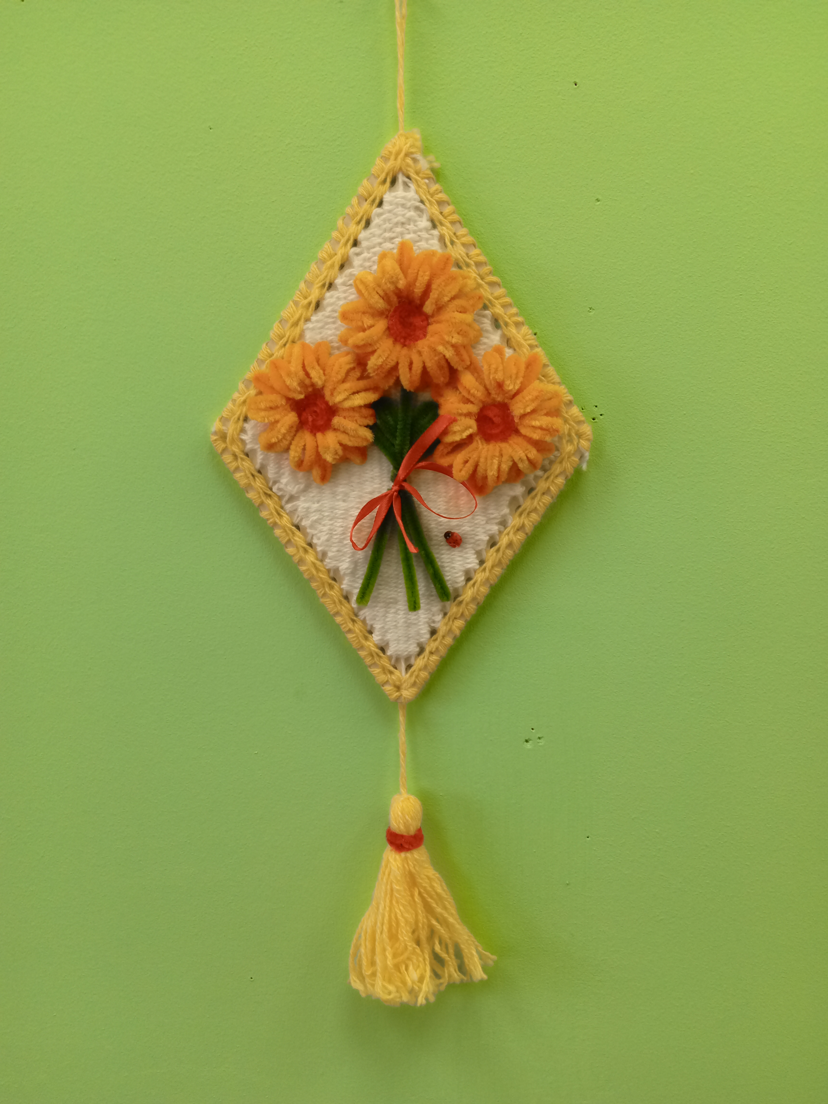 Панно выполнено в технике ручного плетения на деревянной основе, декорирование выполнено из синельной проволоки.Данные участника