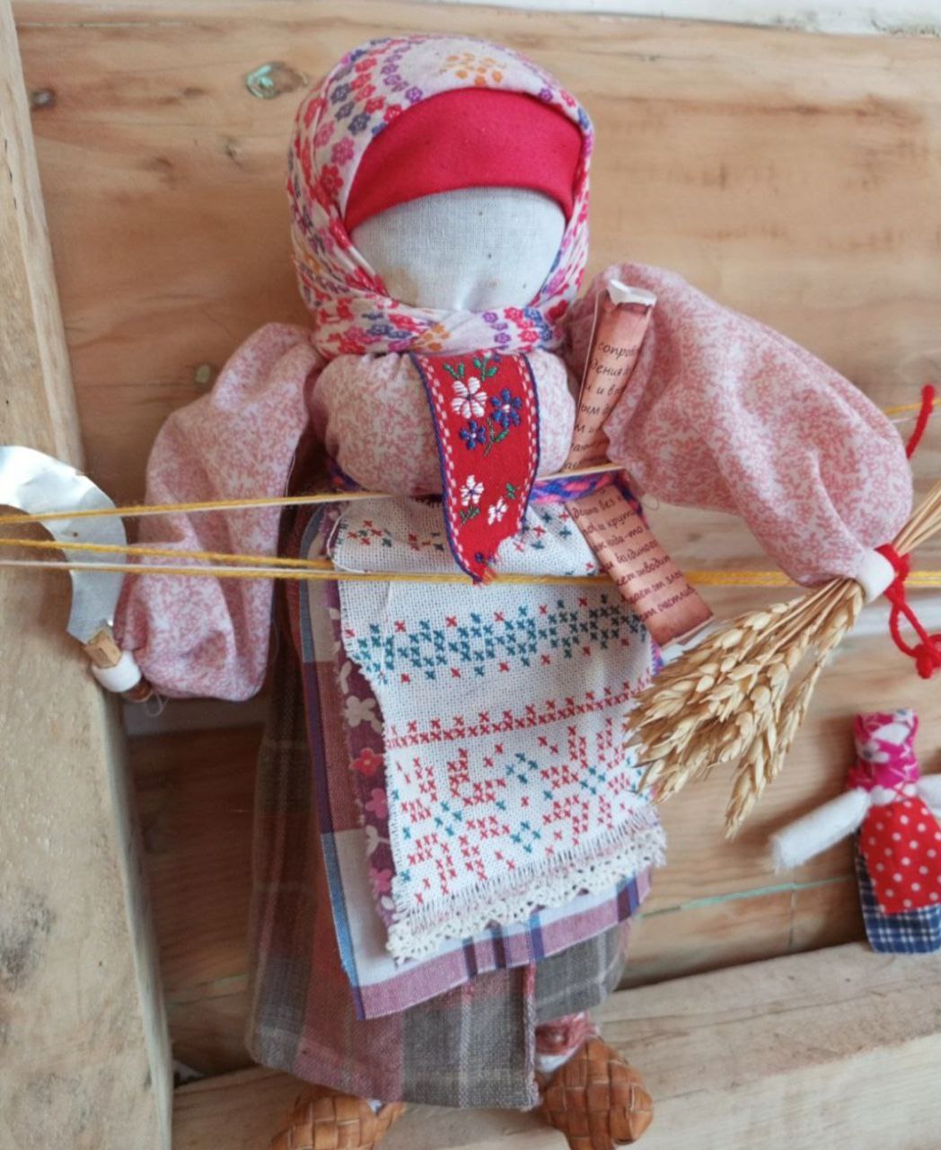 Изготовлена кукла и разноцветных тряпочек, вышита и наряжена в национальный костюм с серпом и колосками пшеницыДанные участника