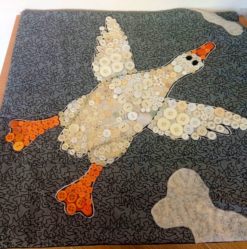 Настенное пано 58×58 с использованием различных видов пуговиц. При создании облаков используется японская вышивка- сашико.Данные участника