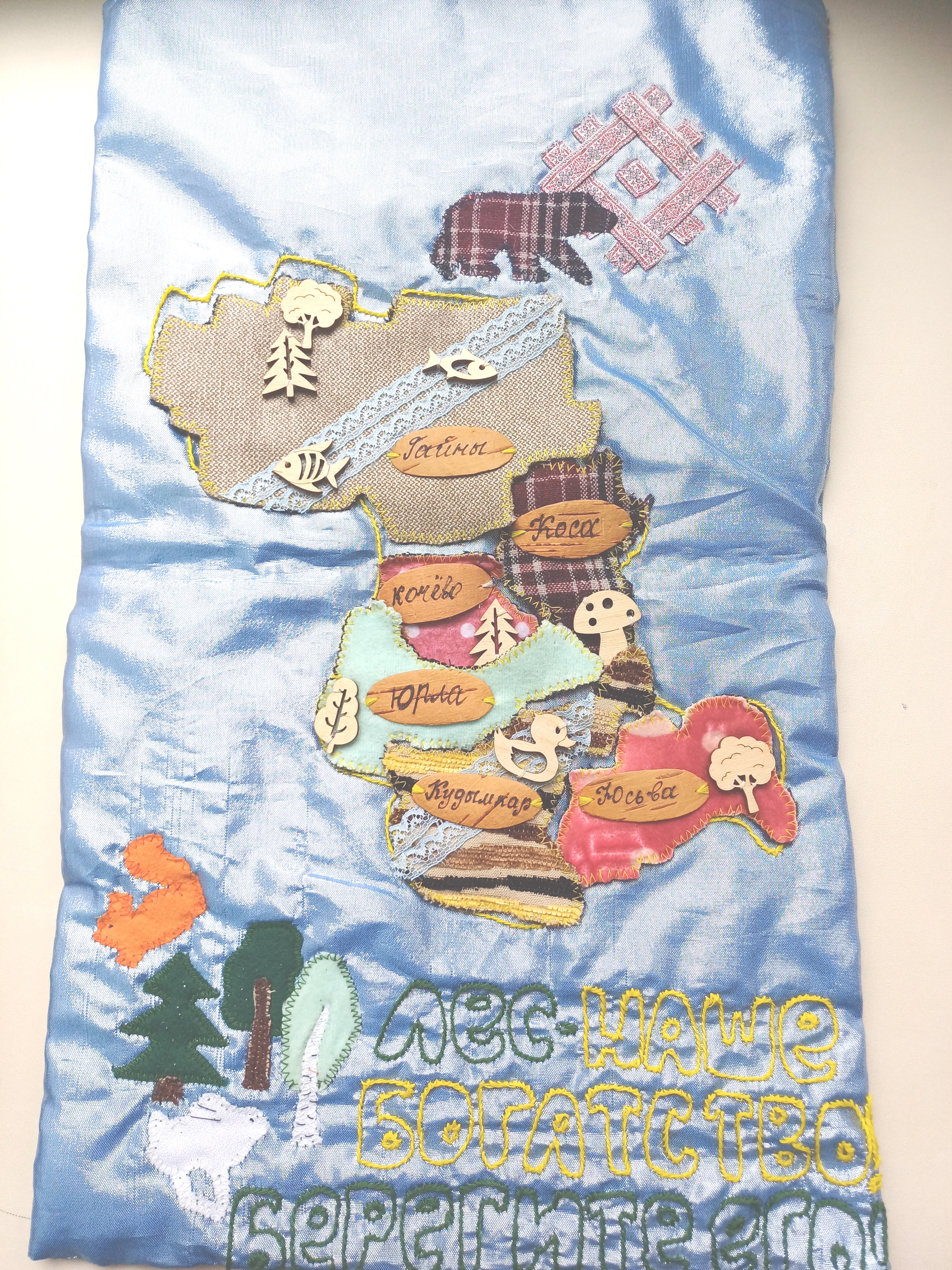 Работа выполнена в технике "Пэчворк". Размеры книги 25 см*30 см., при разворачивании 50 см*60 см. Работа представляет собой тканевую (мягкую) книгу с изображением внутри карты Коми-Пермяцкого округа, с наглядными элементами административных единиц и представители флоры и фауны малой Родины.Данные участника