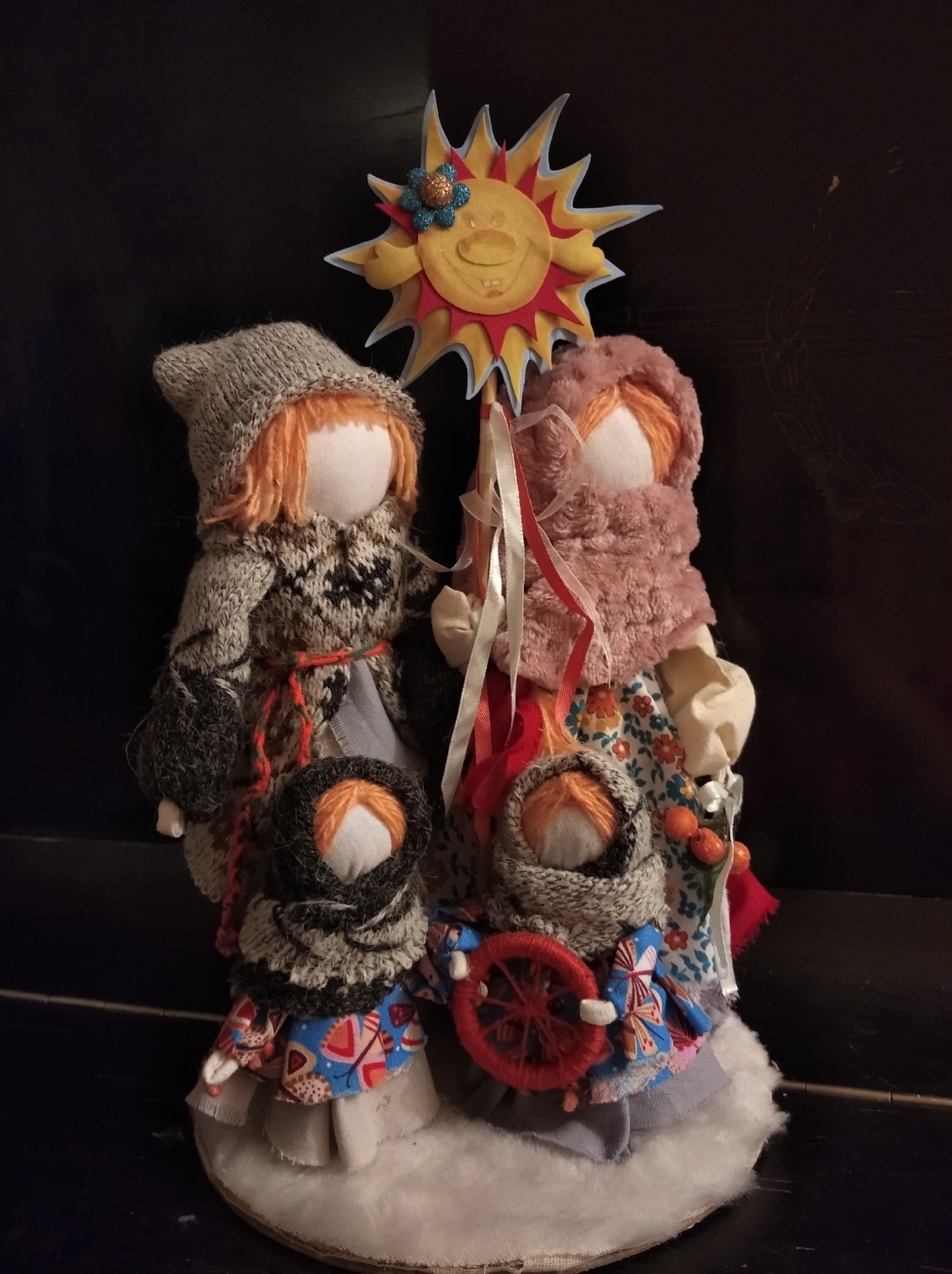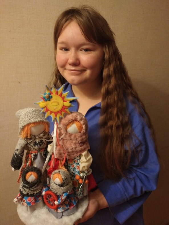 Работа "Колядки" – это воплощение духа праздника Коляда, переплетающегося с зимним солнцестоянием и Рождеством Христовым. В руках мужчины и женщины, словно заря нового дня, на шесте ликует солнышко – символ зарождающегося годового цикла, предвестник добра, богатства и крепкого здоровья. Пылающее колесо, что дочери держат в руках, – отголосок древнего обряда, когда огненный символ солнца катился с горы, разгоняя тьму. Сами куклы, бережно созданные на основе текстильной закрутки, достигают в высоту 36 см и дышат теплом ручной работы и вековыми традициями.Данные участника