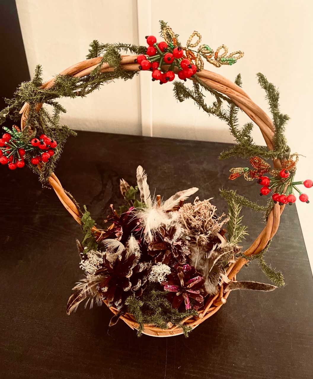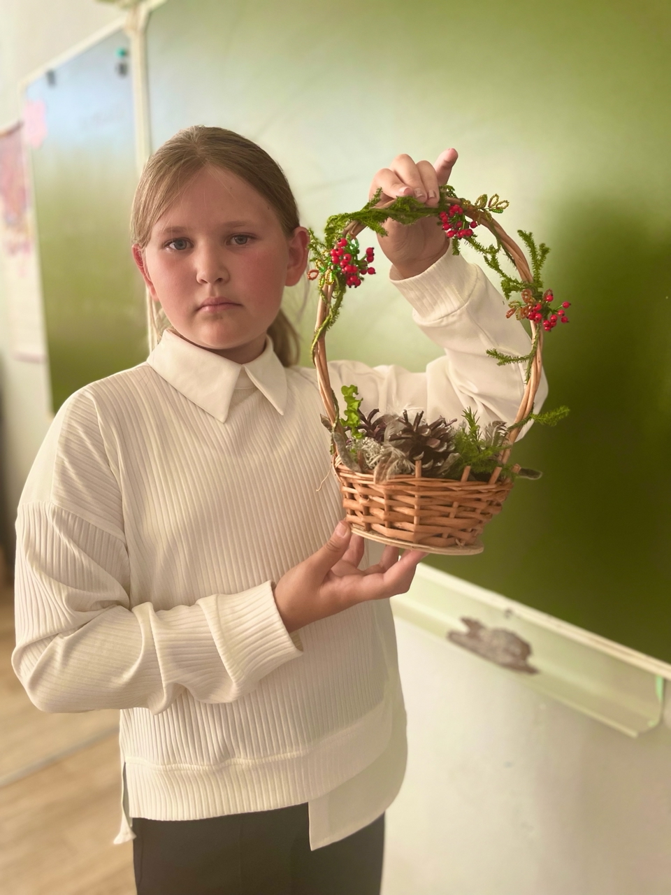 Работа выполнена из природного материала (Прутья ивы, шишки сосны, мох ягель, семена люпина, веточки моха плавуна), перышки птиц и бисера. Размер работы 30см Х 20см.Данные участника