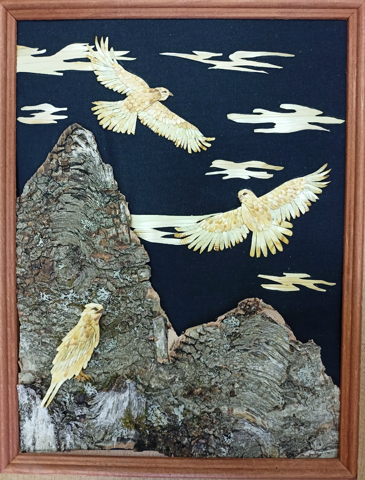 Аппликация из соломы и бересты. Размер работы 30x40. Ястреб-тетеревятник — обычный гнездящийся оседлый вид в Пермском крае. Встречается по всей территории края, в большинстве мест круглогодично, гнездится и зимует в Перми.Данные участника