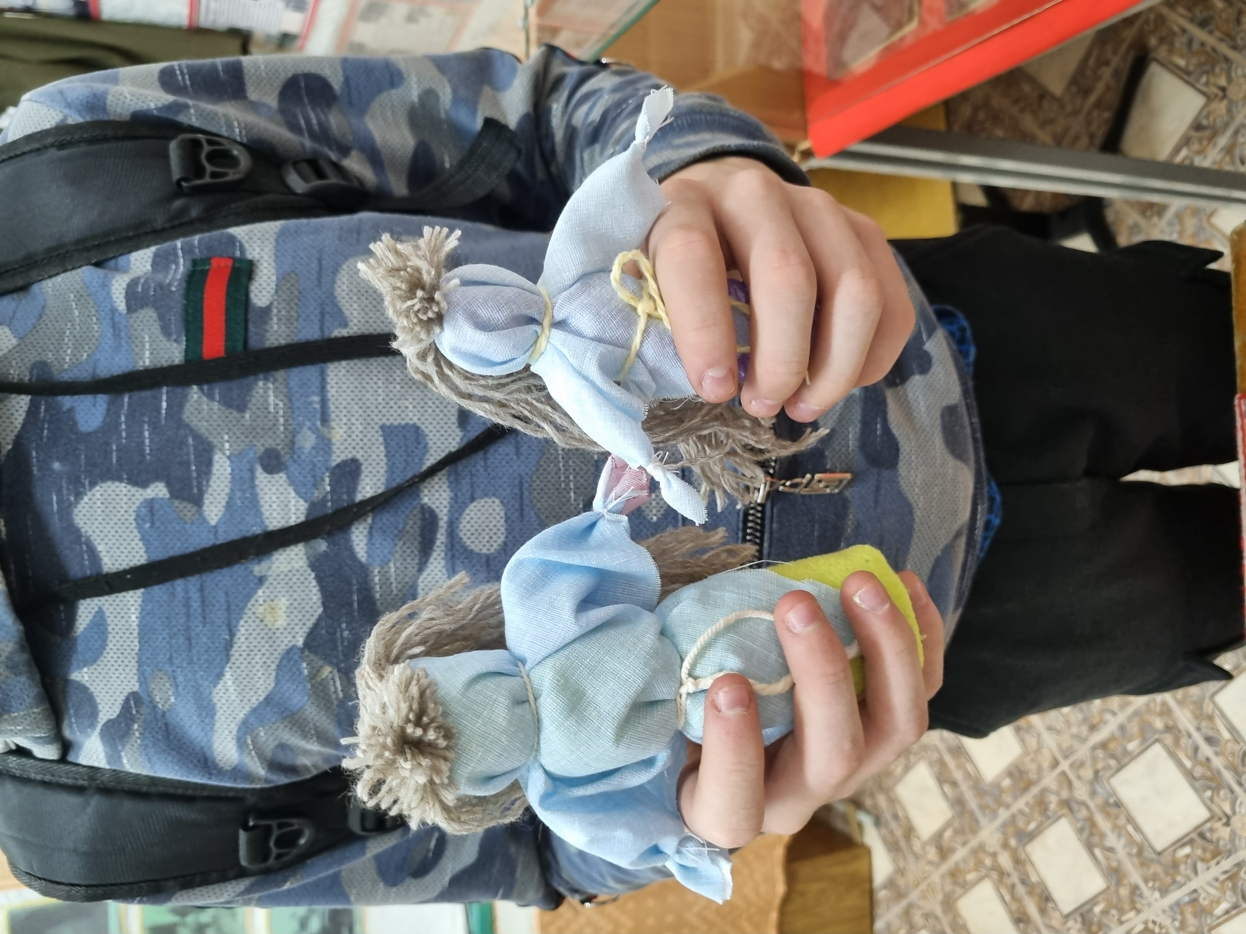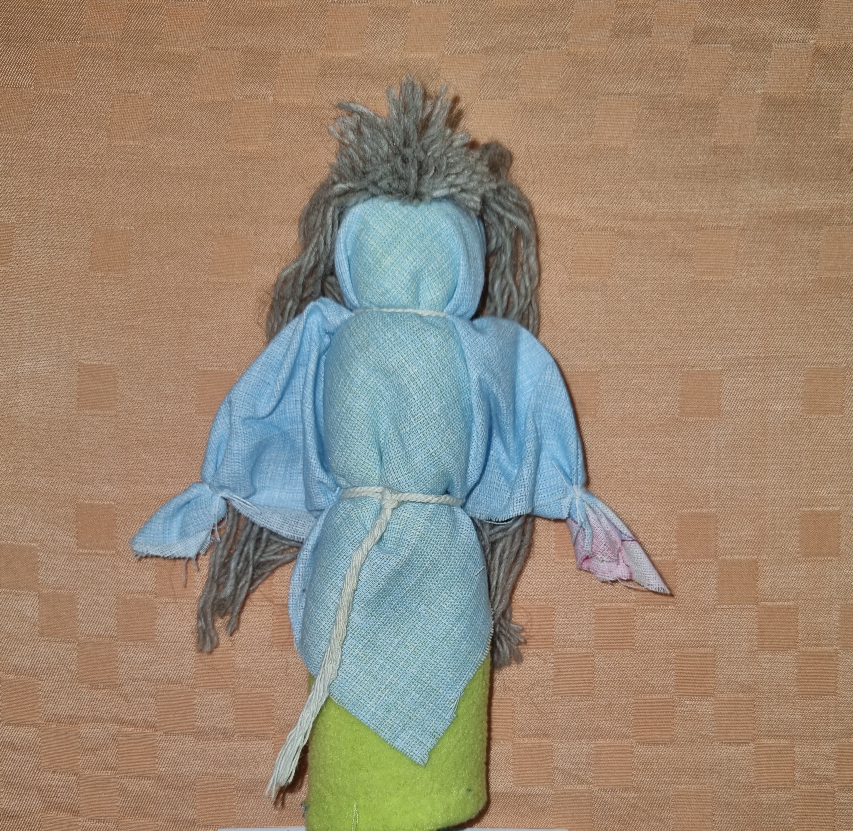 Традиционная кукла масленичного гуляния "Масленка". Масленку изготавливали в период масленичной недели и в отличие от ее большой соломенной сестры - ее не сжигали, а напротив хранили в потайном месте и верили, что она уберегает от бед. Кукла должна быть обязательно без лица, иначе тогда она похитит душу того, кто ее сделал. Изготовлена из ткани. Берется плотная ткань квадратной формы и сворачивается в плотный валик. Затем берем ткань прямоугольной формы из ситца и надеваем на один край валика и перевязываем так, чтобы получилась голова, талия и отдельно скрепляем ручки. Затем, из шерстяных ниток изготавливаем волосы и прикрепляем к голове. Данный мастер-класс мы проводим каждый год у начальных классов.Данные участника