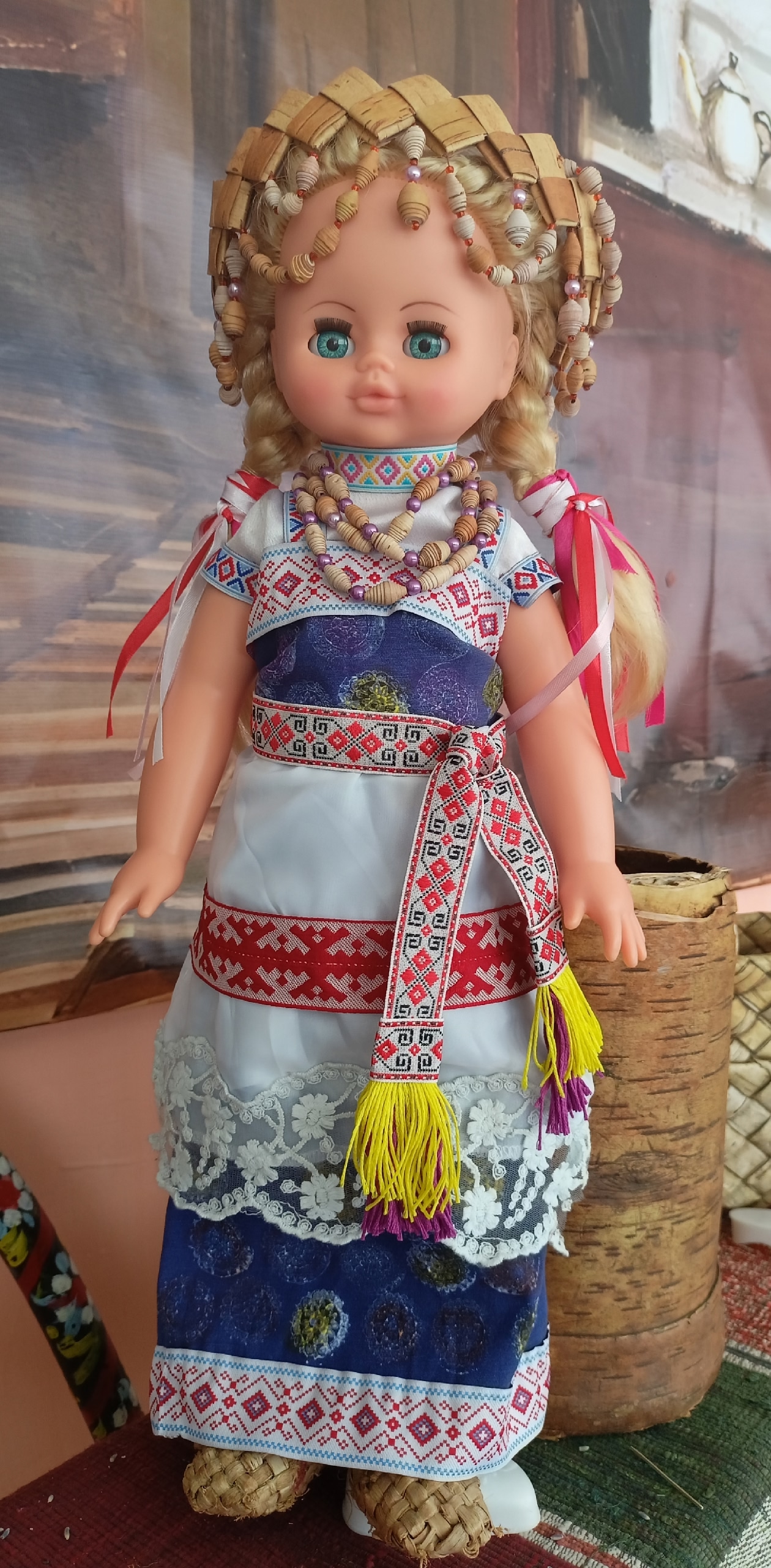 КУКЛА ПРЕДСТАВЛЕНА В КОМИ-ПЕРМЯЦКОМ НАРОДНОМ КОСТЮМЕ. ВЕНОК И БУСЫ ВЫПОЛНЕНЫ В ТЕХНИКЕ ПЛЕТЕНИЯ И ВСКРУЧИВАНИЯ БЕРЕСТЫ. ДЛЯ ОРНАМЕНТА БЫЛИ ВЗЯТЫ ГОТОВЫЕ ЛЕНТЫ. ОНИ БЫЛИ ИСПОЛЬЗОВАНЫ ДЛЯ НАРЯДА. РУБАШКА, ПЛАТЬЕ БЫЛИ СШИТЫ ВРУЧНУЮ ПО ВЫКРОЙКЕ. ЭЛЕМЕНТЫ ОРНАМЕНТА БЫЛИ СШИТЫ ВРУЧНУЮ. ПЛАТЬЕ УКРАСИЛ С ПОМОЩЬЮ ПЕЧАТИ БЕЛОЙ КРАСКОЙ. ДАЛЕЕ БЕЛУЮ КРАСКУ ПОКРЫЛ ЦВЕТНЫМИ КРАСИТЕЛЯМИ.КУКЛА ВЫСОТОЙ 50 СМ.Данные участника