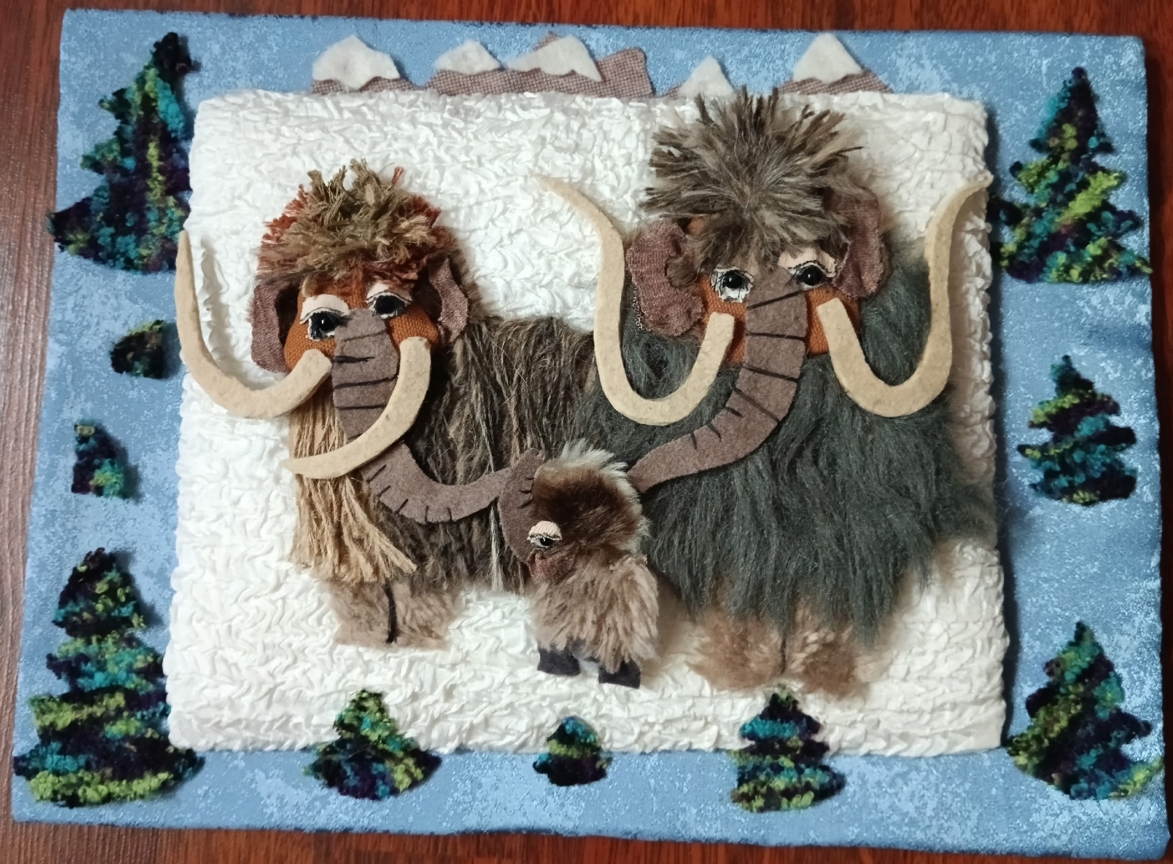 Панно размером 38*28 см выполнено в технике аппликации из текстильных материалов: ткань, искусственный мех, фетр. Сюжет композиции: вымершие виды животных территории Пермского края.Данные участника