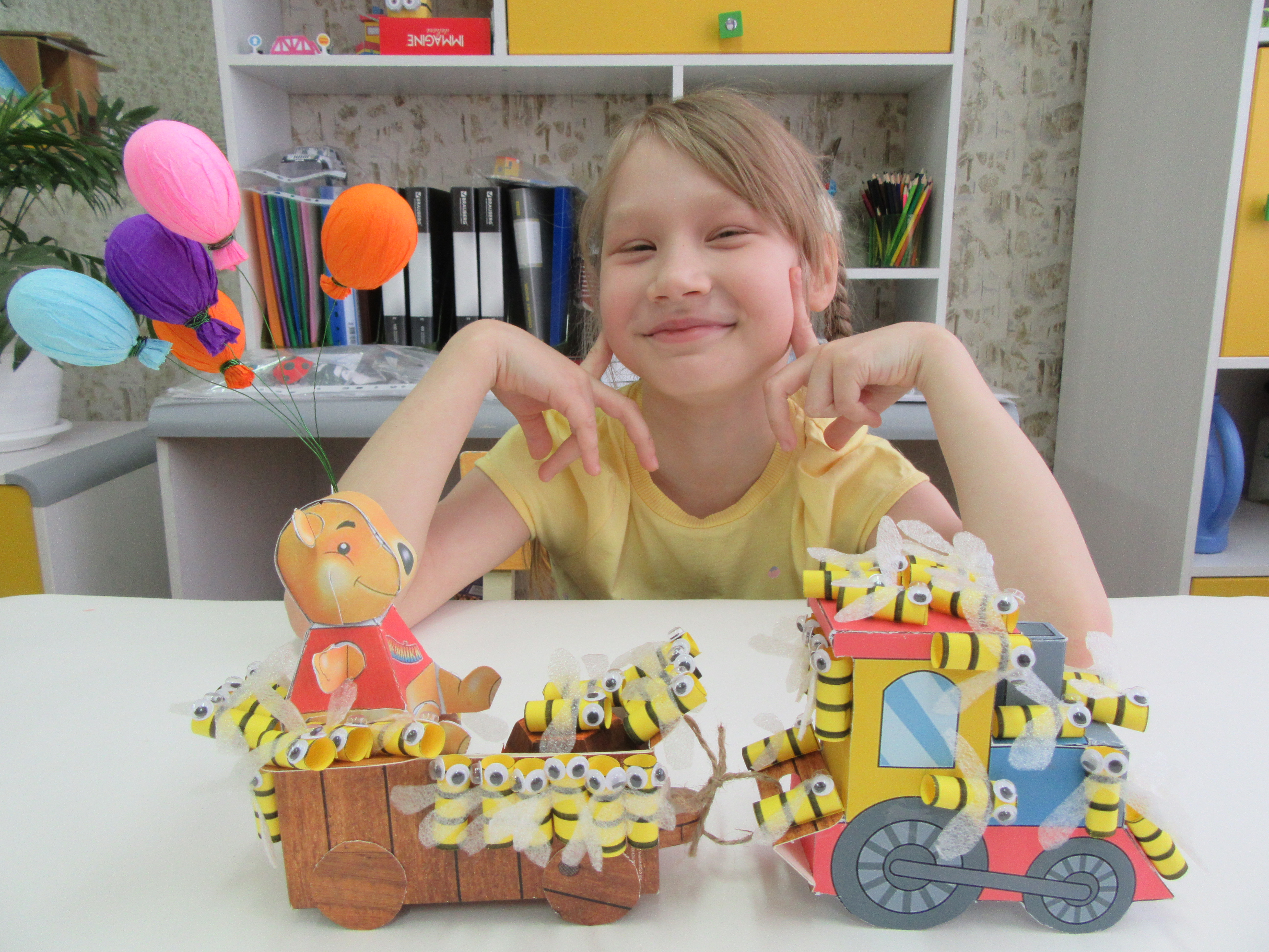 Творческая композиция создана из цветного картона и бумаги. Основные детали, паровоз и медведь, выполнены в технике «бумажная модель». 53 пчелы склеены из бумажных трубочек и дополнены деталями глаз и крыльев. Цветные шарики в лапках медведя изготовлены на основе формованного пенопласта, покрыты крепированой бумагой, и приклеены к проволоке.Данные участника