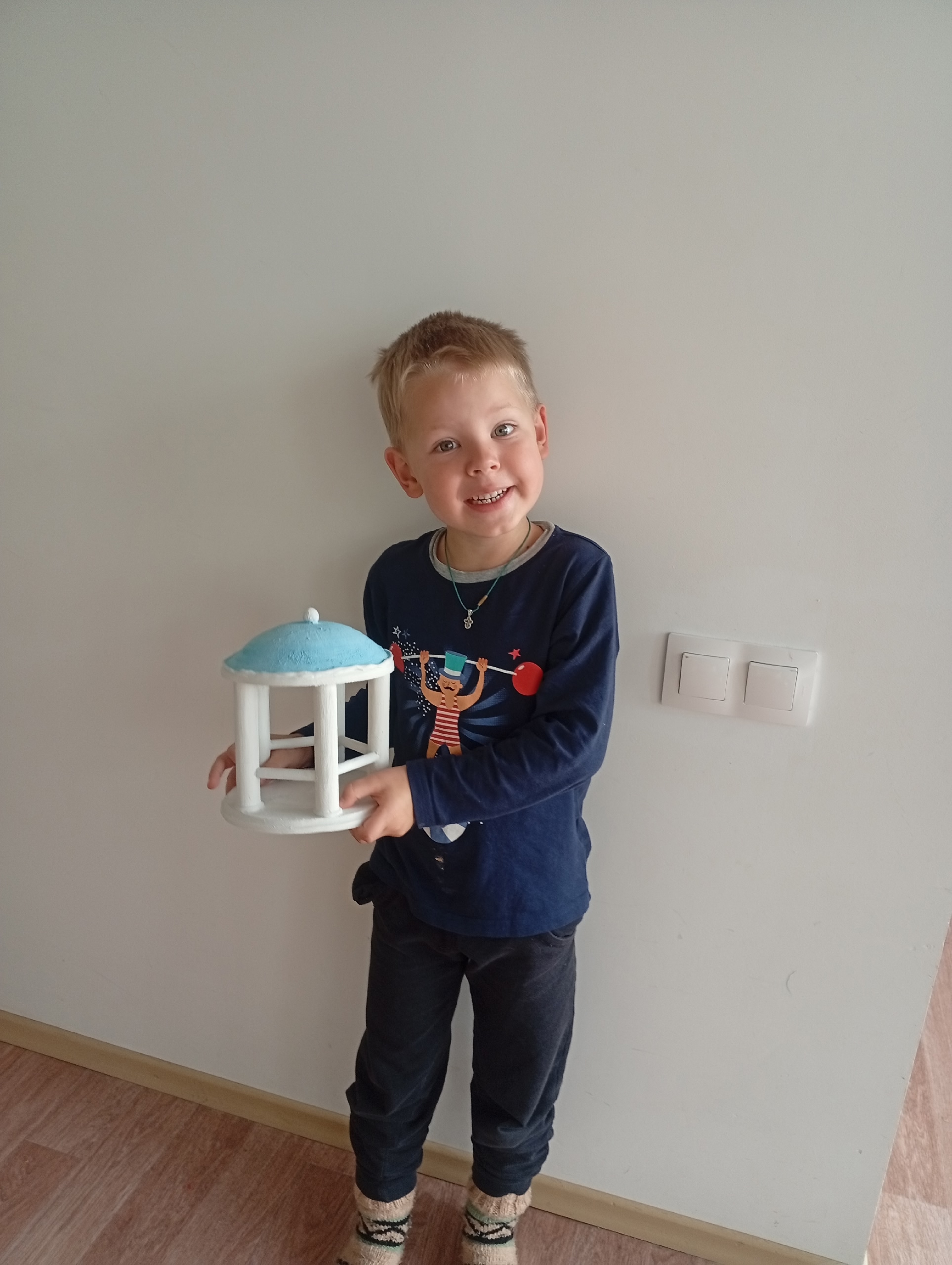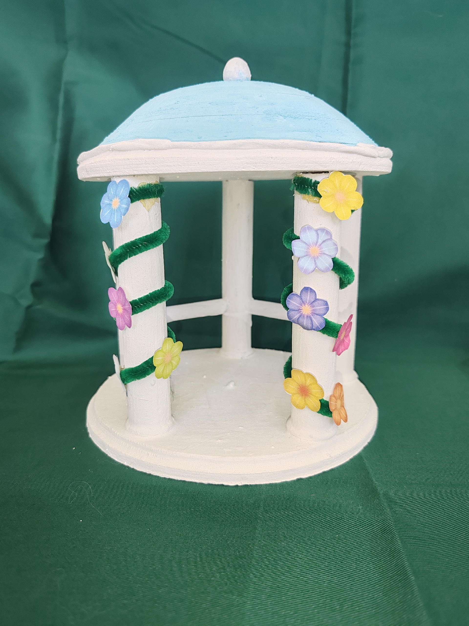 "Пермская ротонда"На изображении представлена миниатюра пермской ратонды. Она выполнена в виде белого сооружения с голубой крышей. Столбы, поддерживающие крышу, украшены яркими цветами различных оттенков, что придает модели живой и праздничный вид. Подоснова ротонда выполн