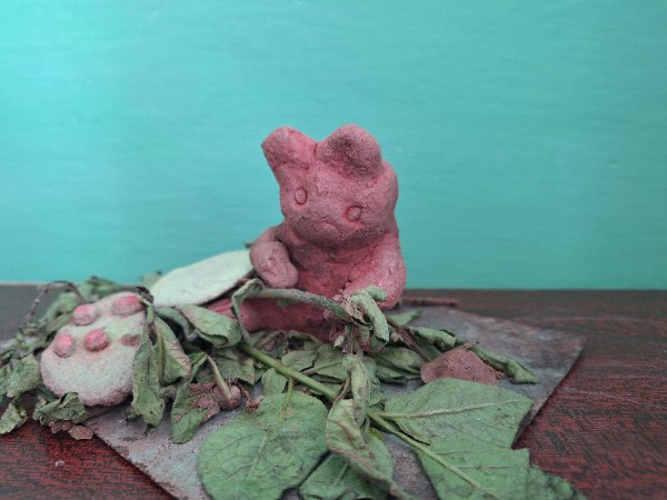 Ош (медведь) изготовлен из глины. Сидит в лесу и лакомится лесными ягодами .Данные участника