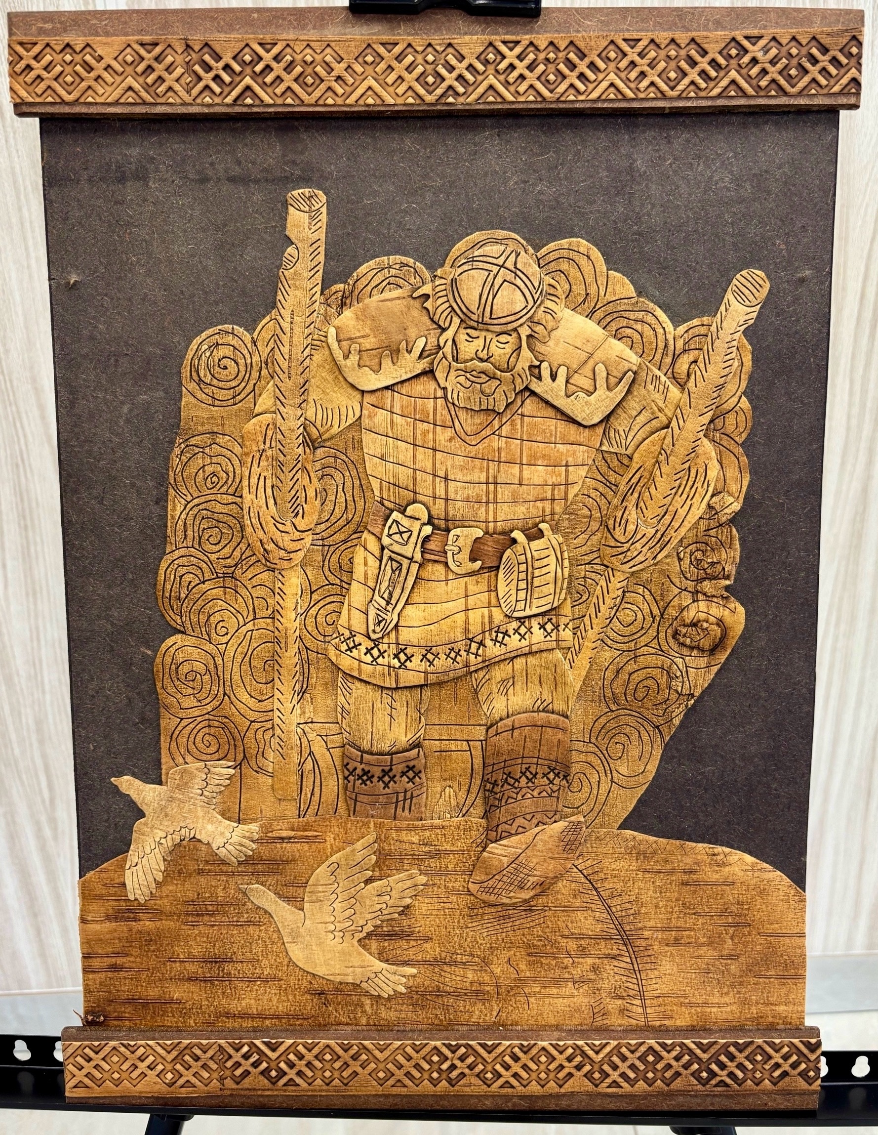 Размер 55см/40см выполнено в технике аппликации и тиснения. Материалы: береста, ДВП. Выполнено по мотивам коми-пермяцких легенд.Данные участника