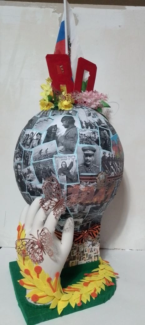 Работа выполнена в технике "папье-маше", с использованием гипса, картона, фетра, цветной бумаги. Высота работы 80 сантиметров. Посвящается Победе в Великой Отечественной войне 1941-1945гг.Данные участника