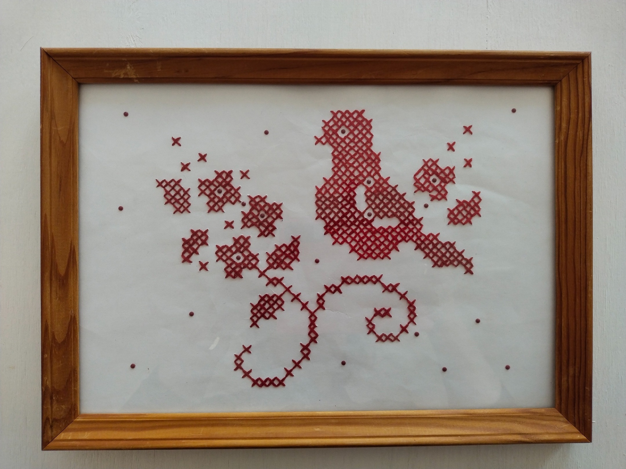 Работа "Птичка певчая" выполнена в технике вышивка крестиком на картоне, нитками мулине красного цвета. Пение певчих птиц ассоциируется с новыми начинаниями и обещанием лучшего завтра. Размер - А4Данные участника