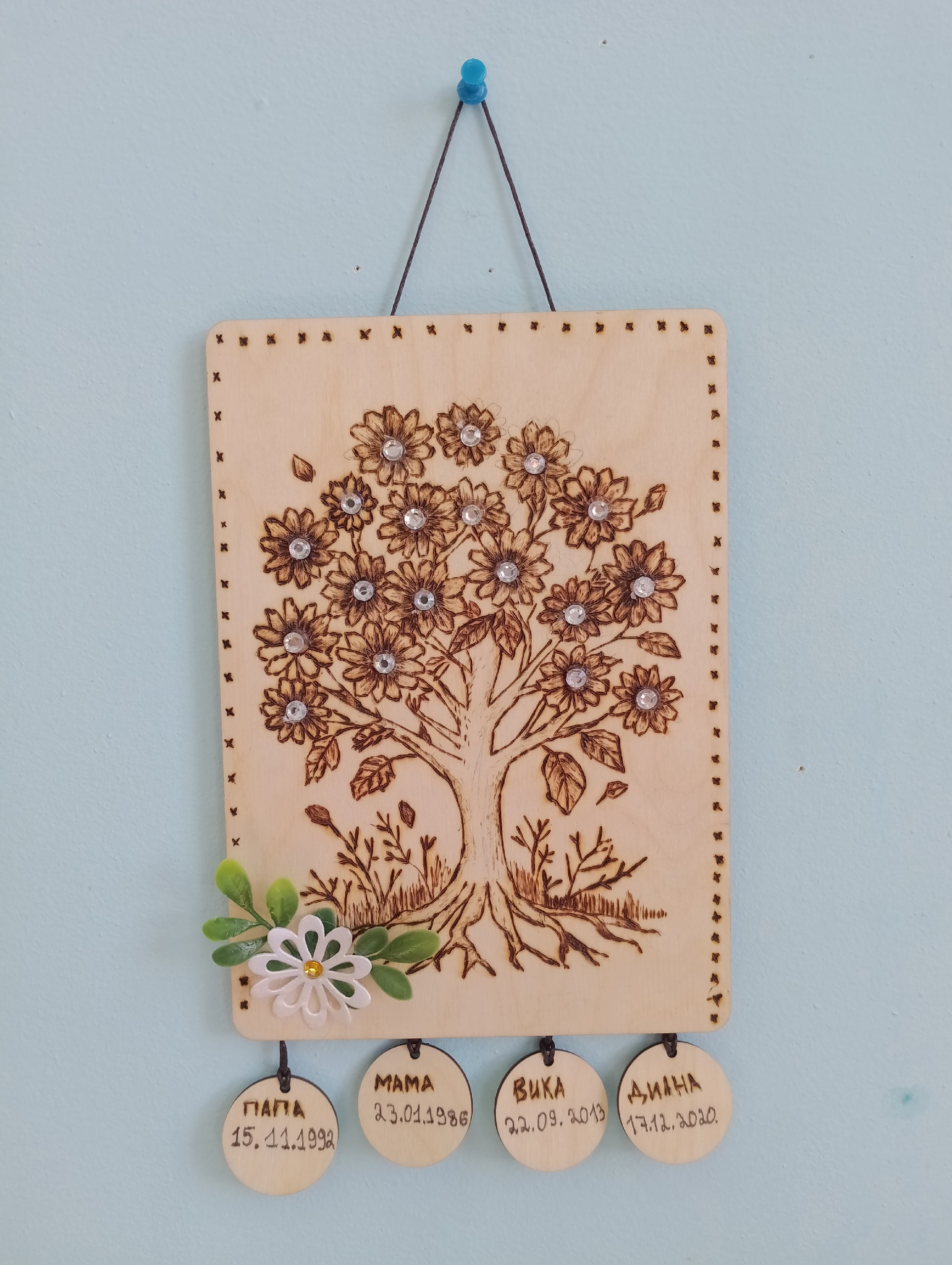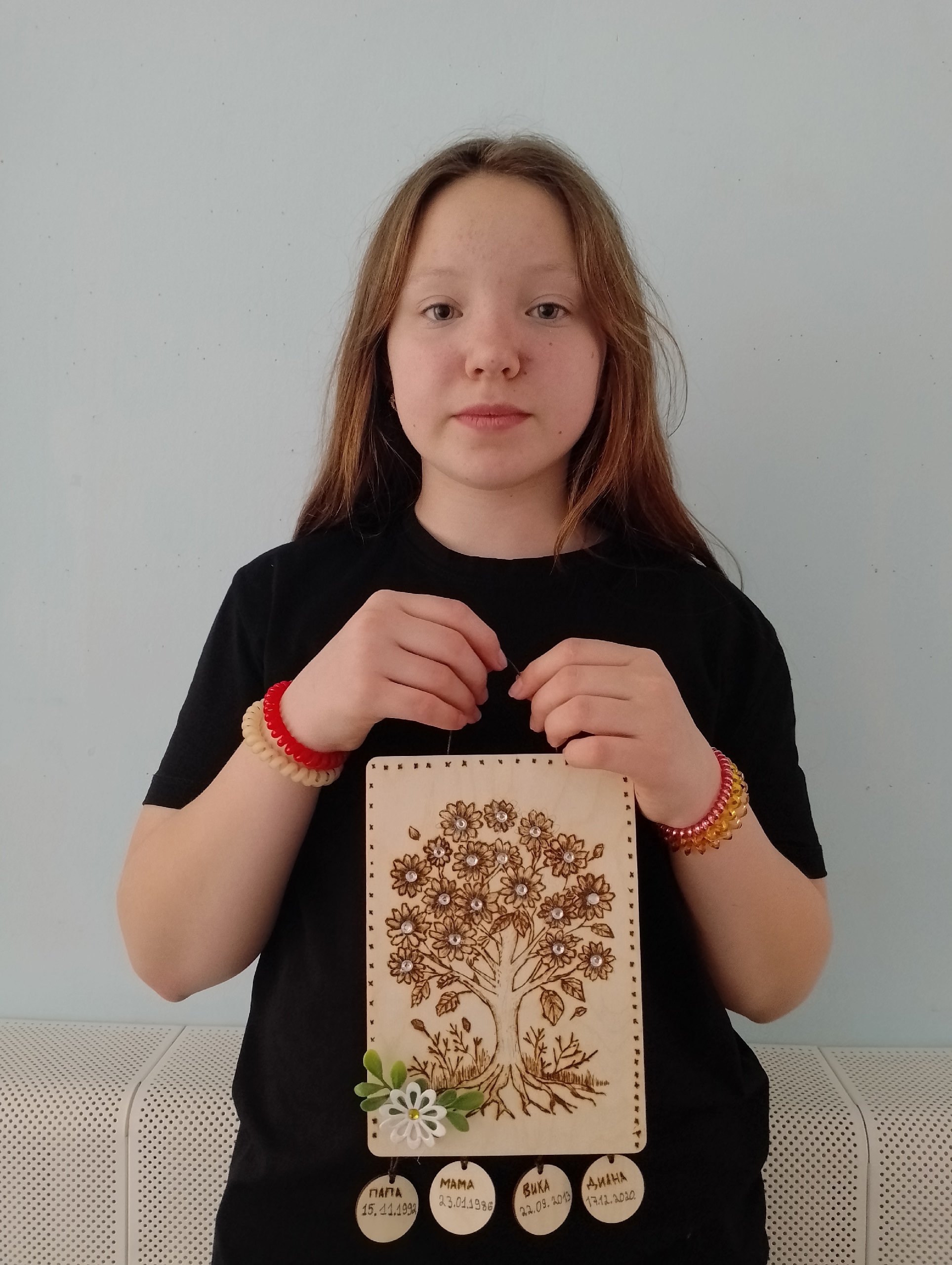 Размер 15*22, работа выполнена на деревянной основе в технике выжигания с использованием декоративных элементов.Данные участника